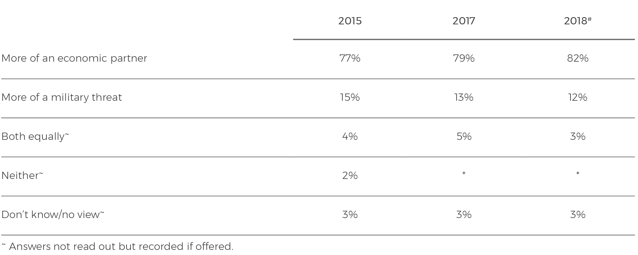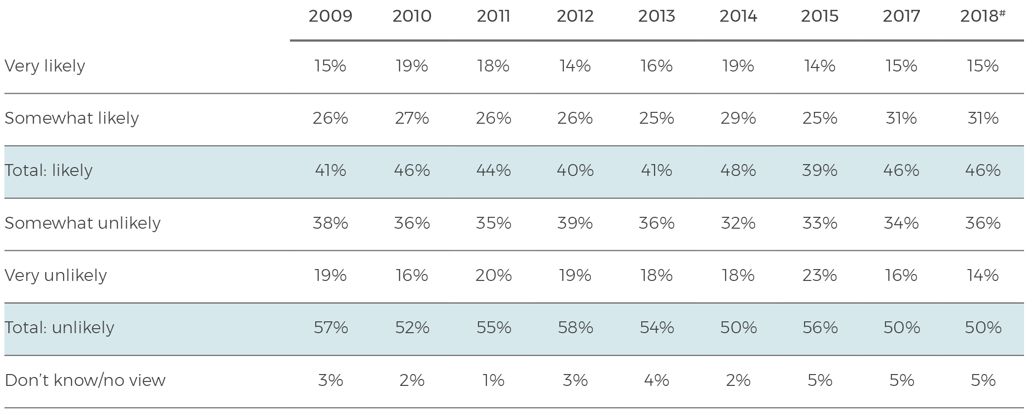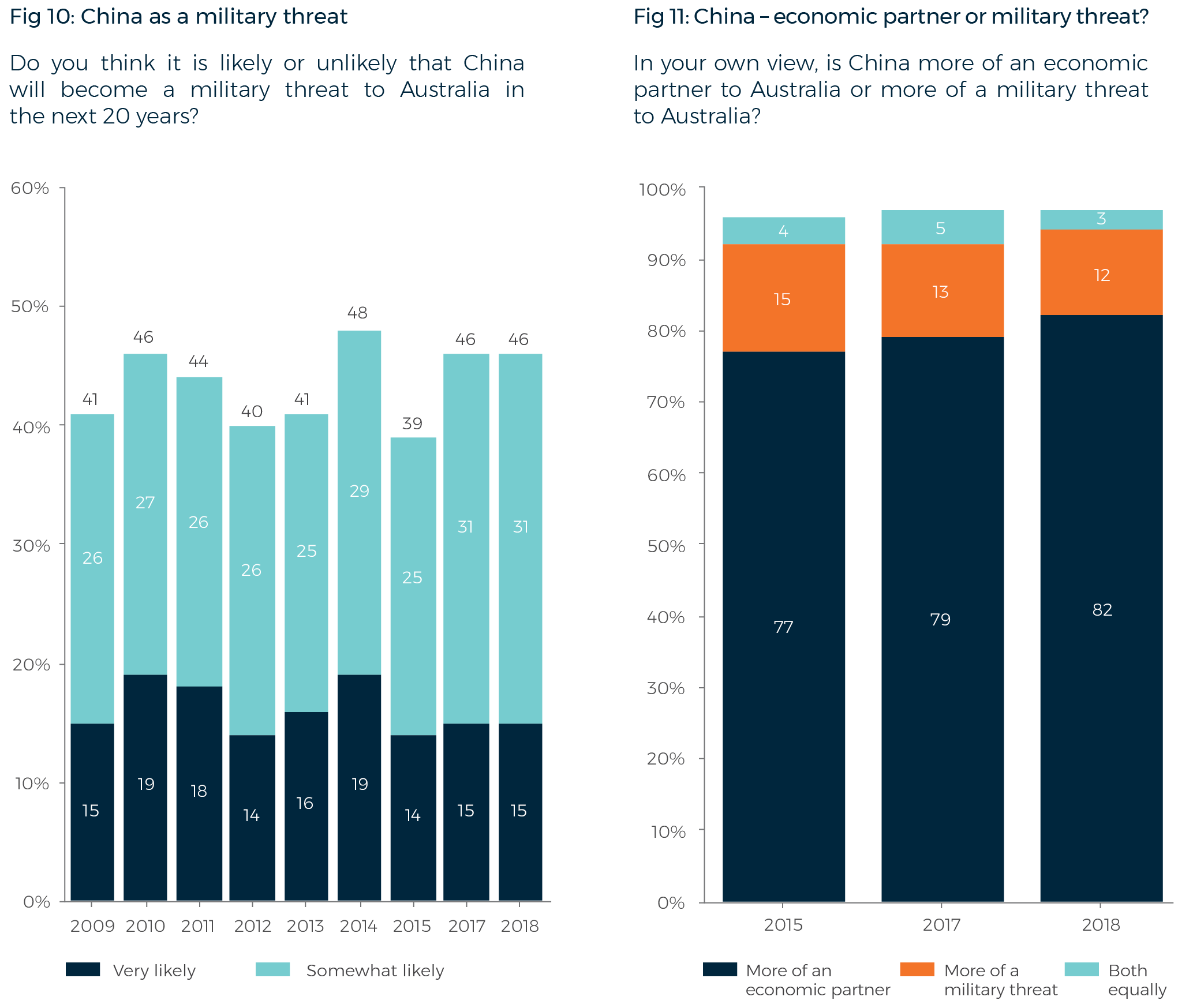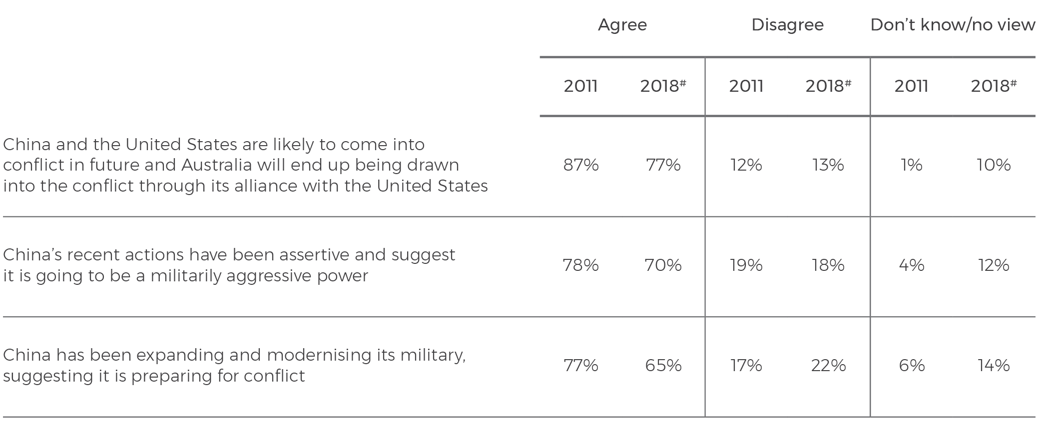 This year, as in eight consecutive years previously, a significant proportion of the Australian population sees China as a potential military threat to Australia in the future. In 2018, 46% of Australians say it is likely that ‘China will become a military threat to Australia in the next 20 years’.