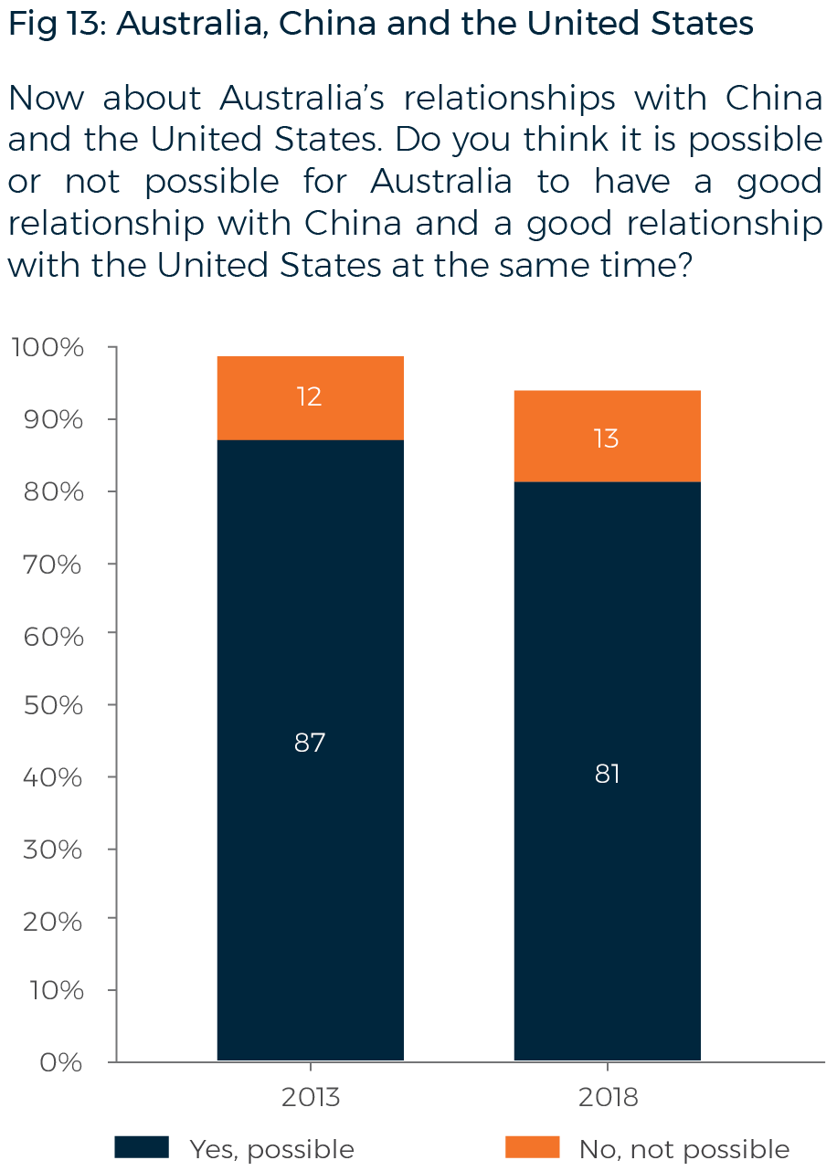 At a time when the United States and a rising China are fast becoming strategic competitors in the region, there is an increasing debate about whether Australia will eventually be forced to choose between the United States, as its alliance partner, and China, as its largest trading partner. However, around eight in ten (81%) Australians would disagree, saying it is ‘possible for Australia to have a good relationship with China and a good relationship with the United States at the same time’. While this is a six-point drop from the 87% who said this in 2013, it remains a very strong majority. Only 13% say it is not possible for Australia to maintain good relationships with both.