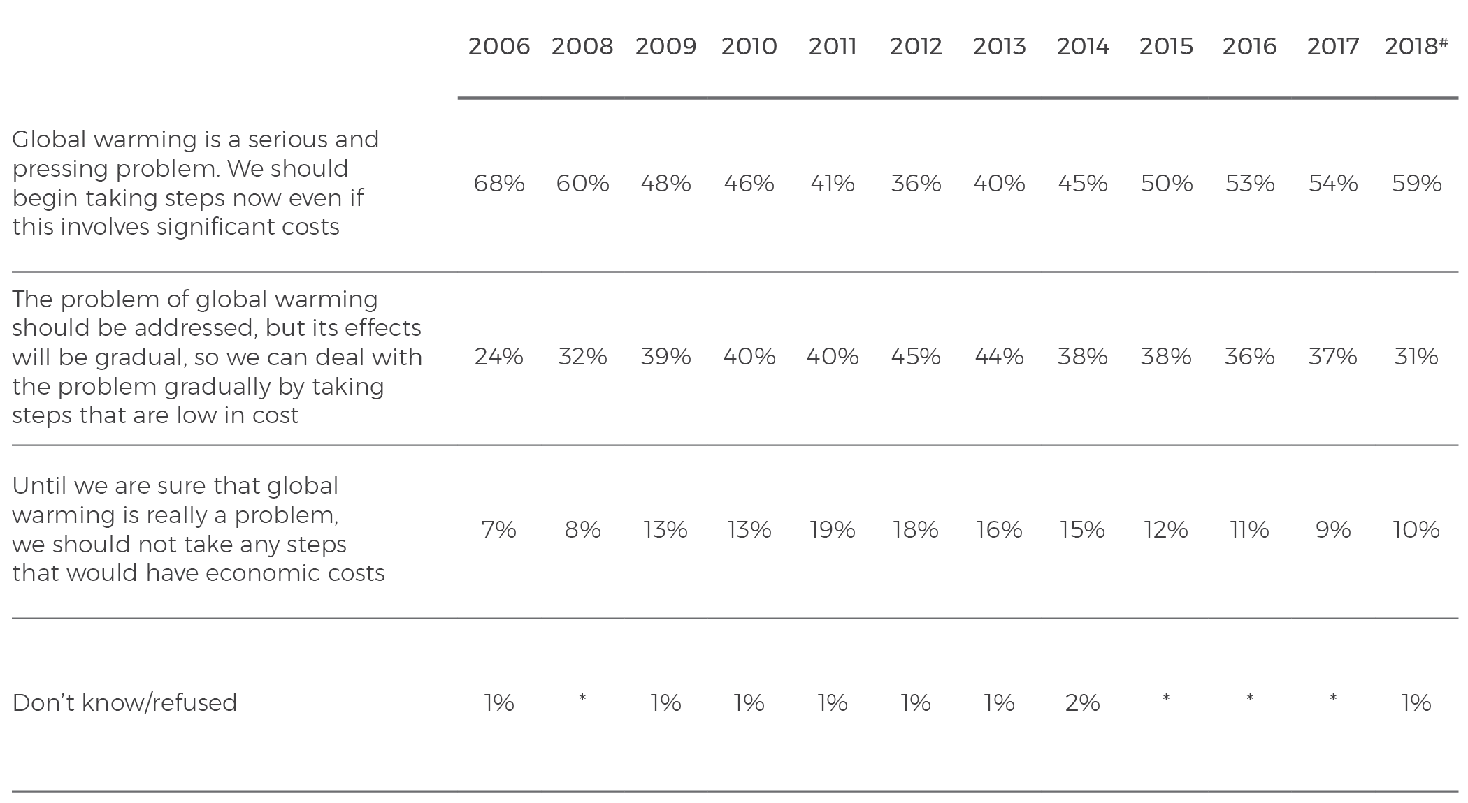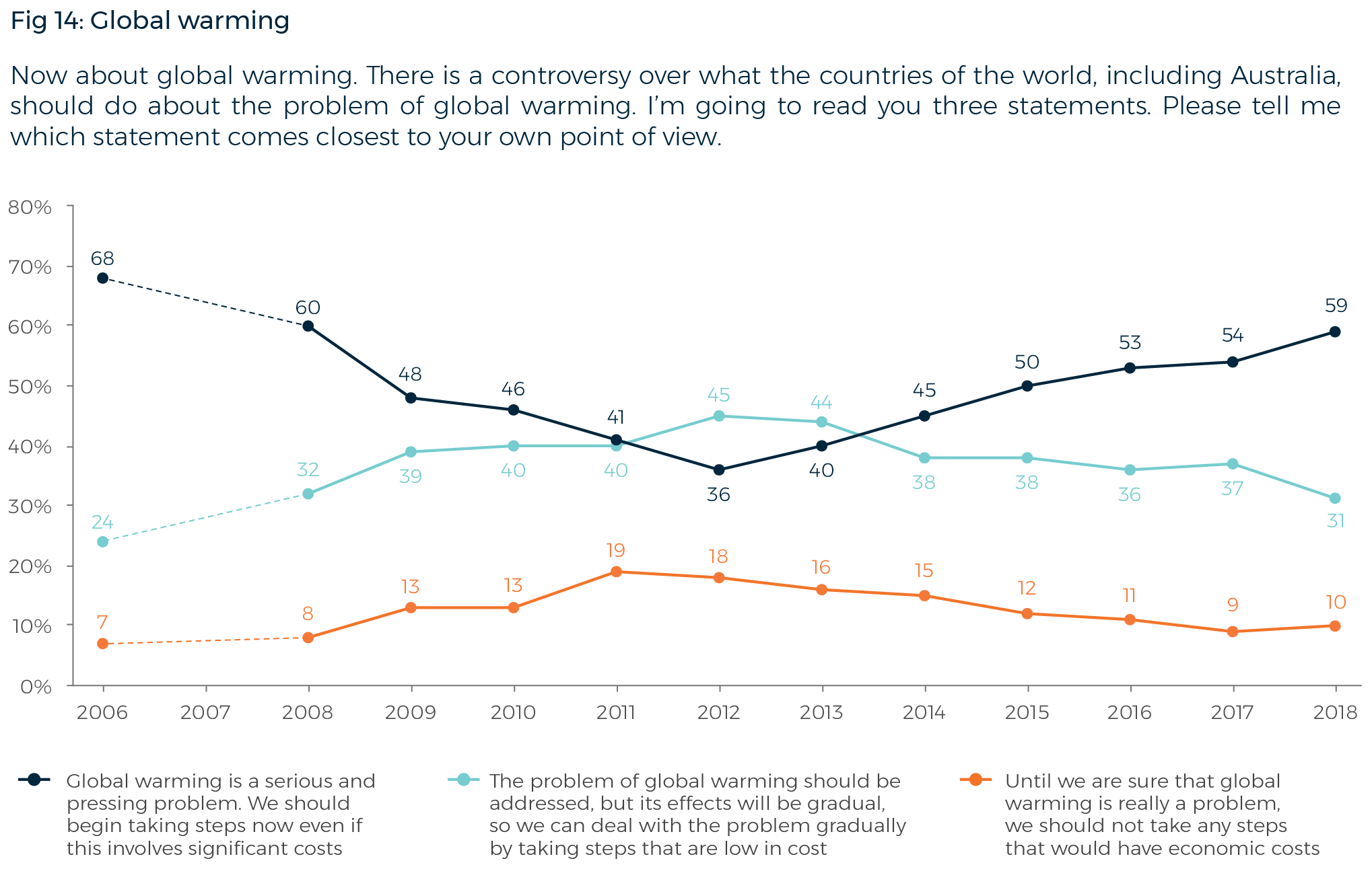 Attitudes about climate change have been undergoing a dramatic reversal over the past six years. The number of Australians who saw global warming as a ‘serious and pressing problem’ about which ‘we should begin taking steps now even if this involves significant costs’ fell from 68% in 2006 to 36% in 2012. Since then, however, concern about global warming has been rising steadily. In 2018, almost six in ten Australians (59%) say global warming is ‘a serious and pressing problem’, up five points since 2017 and 23 points since 2012.