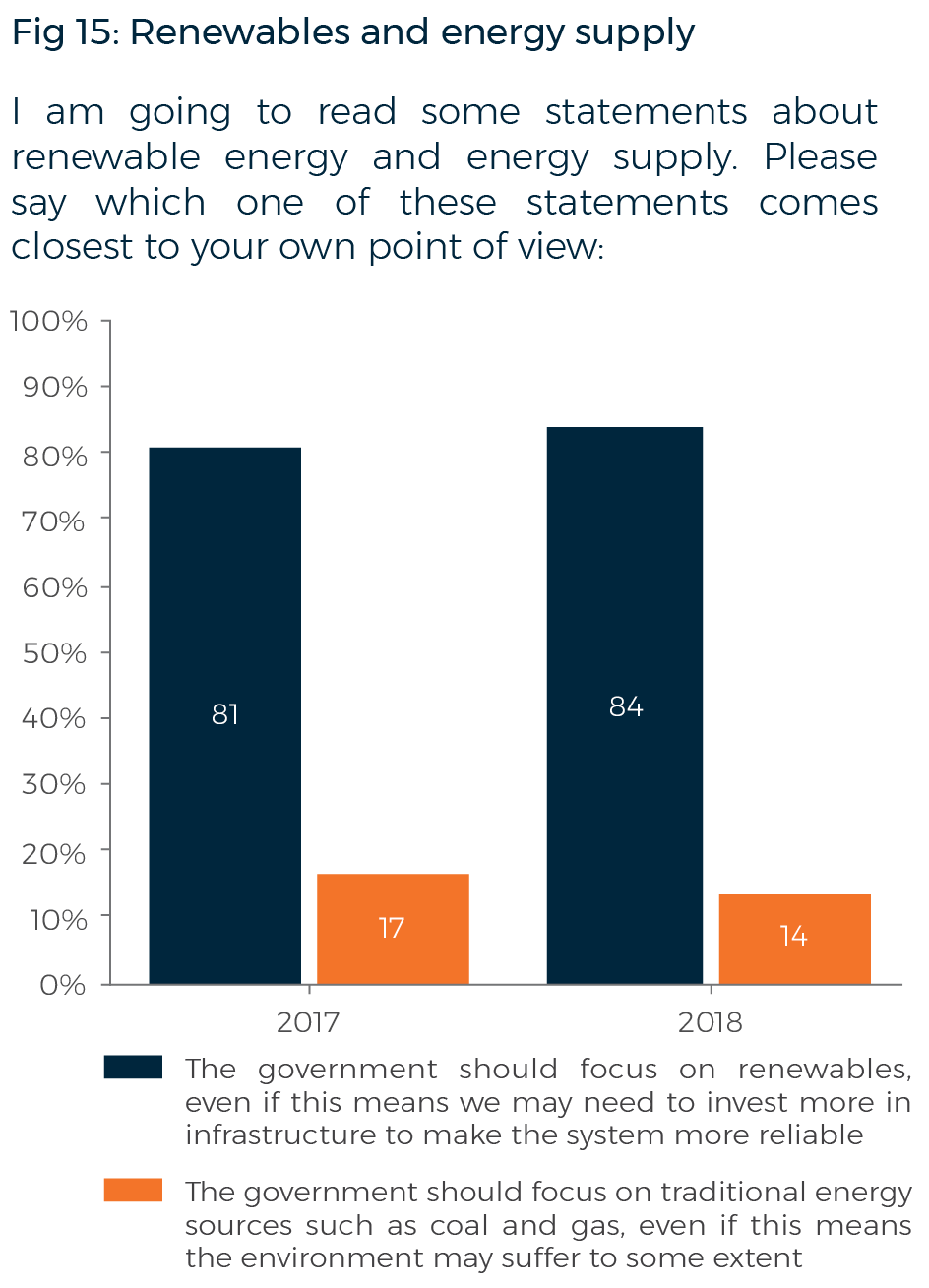 In 2018, 59% of Australians (up five points) say ‘global warming is a serious and pressing problem’ about which ‘we should begin taking steps now even if this involves significant costs’. Almost all Australians (84%, up three points) say ‘the government should focus on renewables, even if this means we may need to invest more in infrastructure to make the system more reliable’. Only 14% say ‘the government should focus on traditional energy sources such as coal and gas, even if this means the environment may suffer to some extent’.