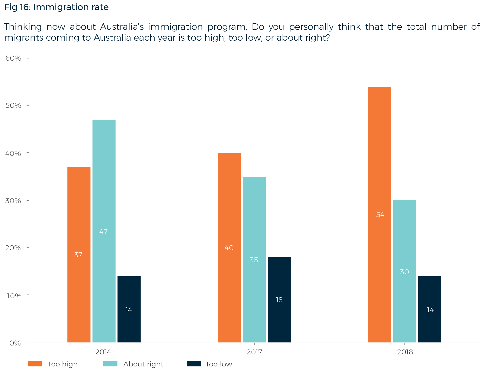 For the first time, the Lowy Institute Poll has found that a majority of Australians oppose the current rate of immigration to Australia. In 2018, 54% of Australians say that ‘the total number of migrants coming to Australia each year is too high’. A minority (44%), say it is either ‘about right’ (30%) or ‘too low’ (14%). These results represent a significant rise in opposition to the existing migration rate – up 14 points since last year, and up 17 points since we first asked this question in 2014.