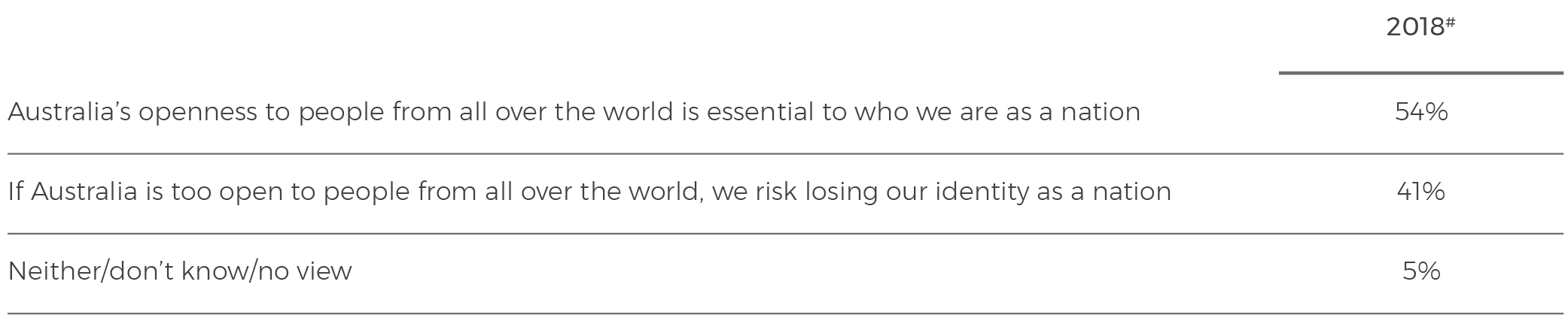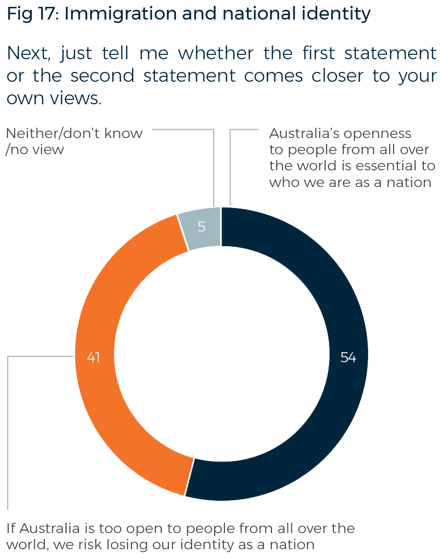A majority (54%) say ‘the total number of migrants coming to Australia each year is too high’; 30% say it is ‘about right’; and 14% say it is ‘too low’. The same-sized majority say ‘Australia’s openness to people from all over the world is essential to who we are as a nation’. However, 41% say ‘if Australia is too open to people from all over the world, we risk losing our identity as a nation’.