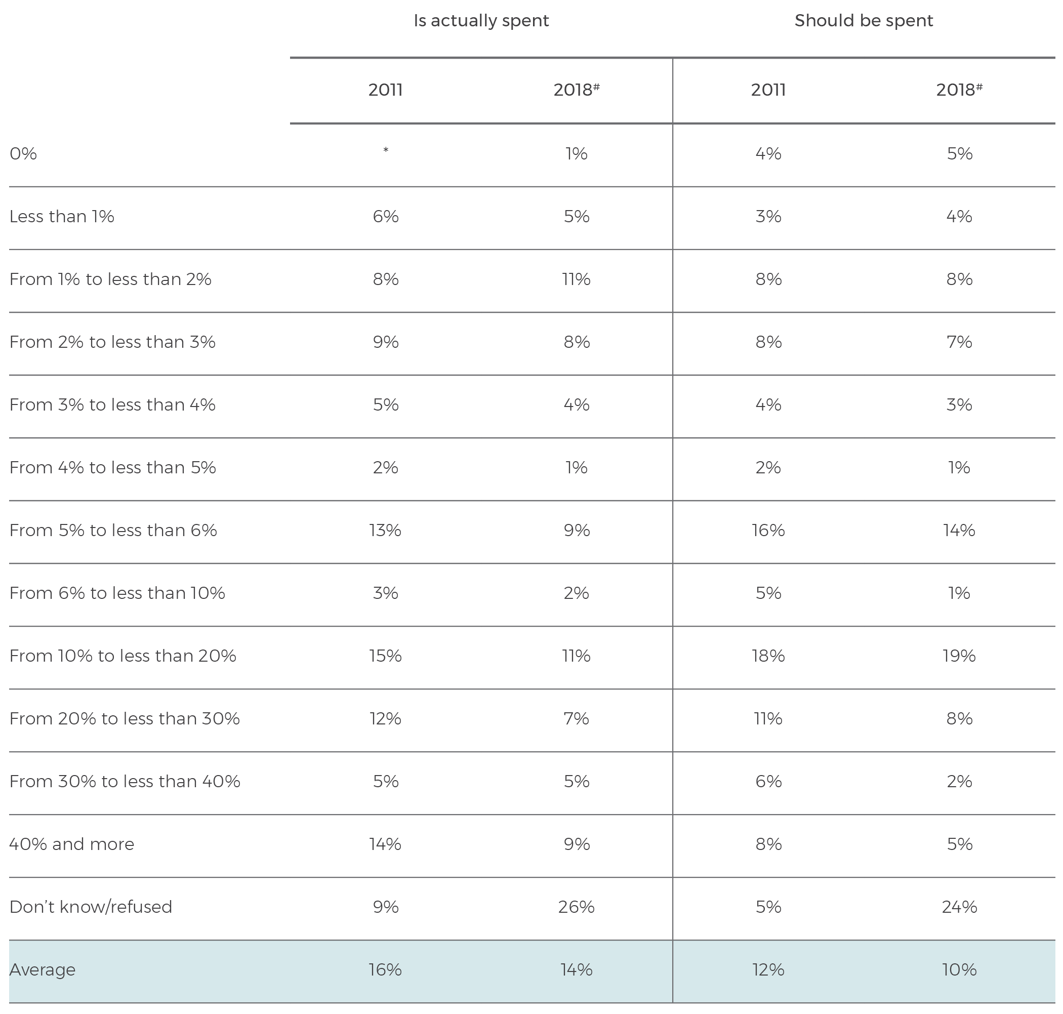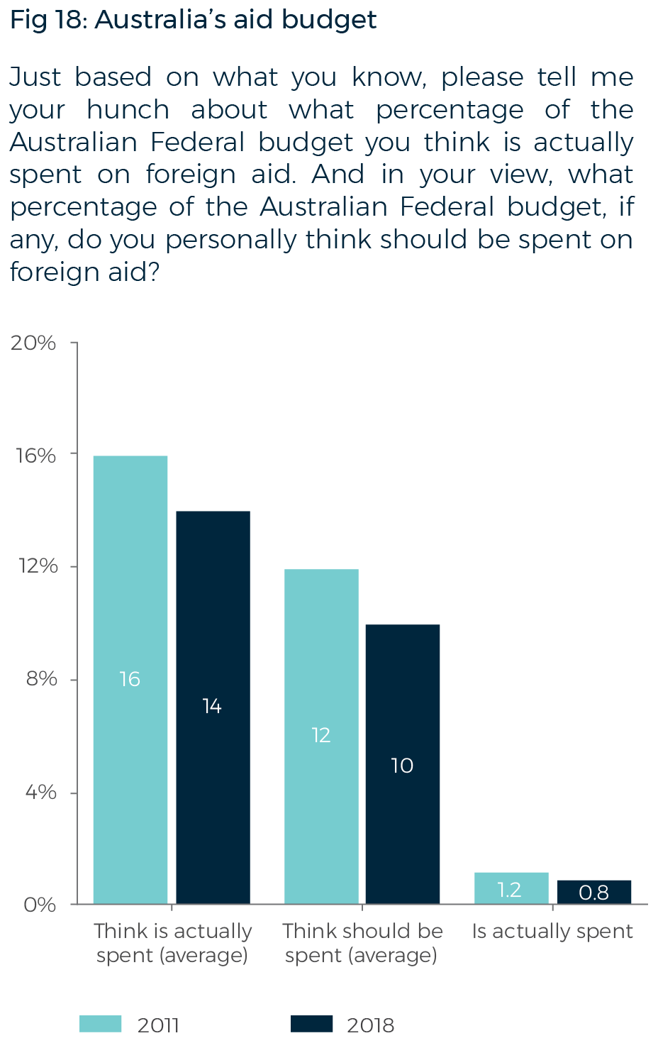 When asked what percentage of the government budget is spent on foreign aid, Australians on average think that 14% of the budget is spent on aid, while they say 10% should be spent on aid. Australia’s aid budget is approximately 0.8% of the federal budget.