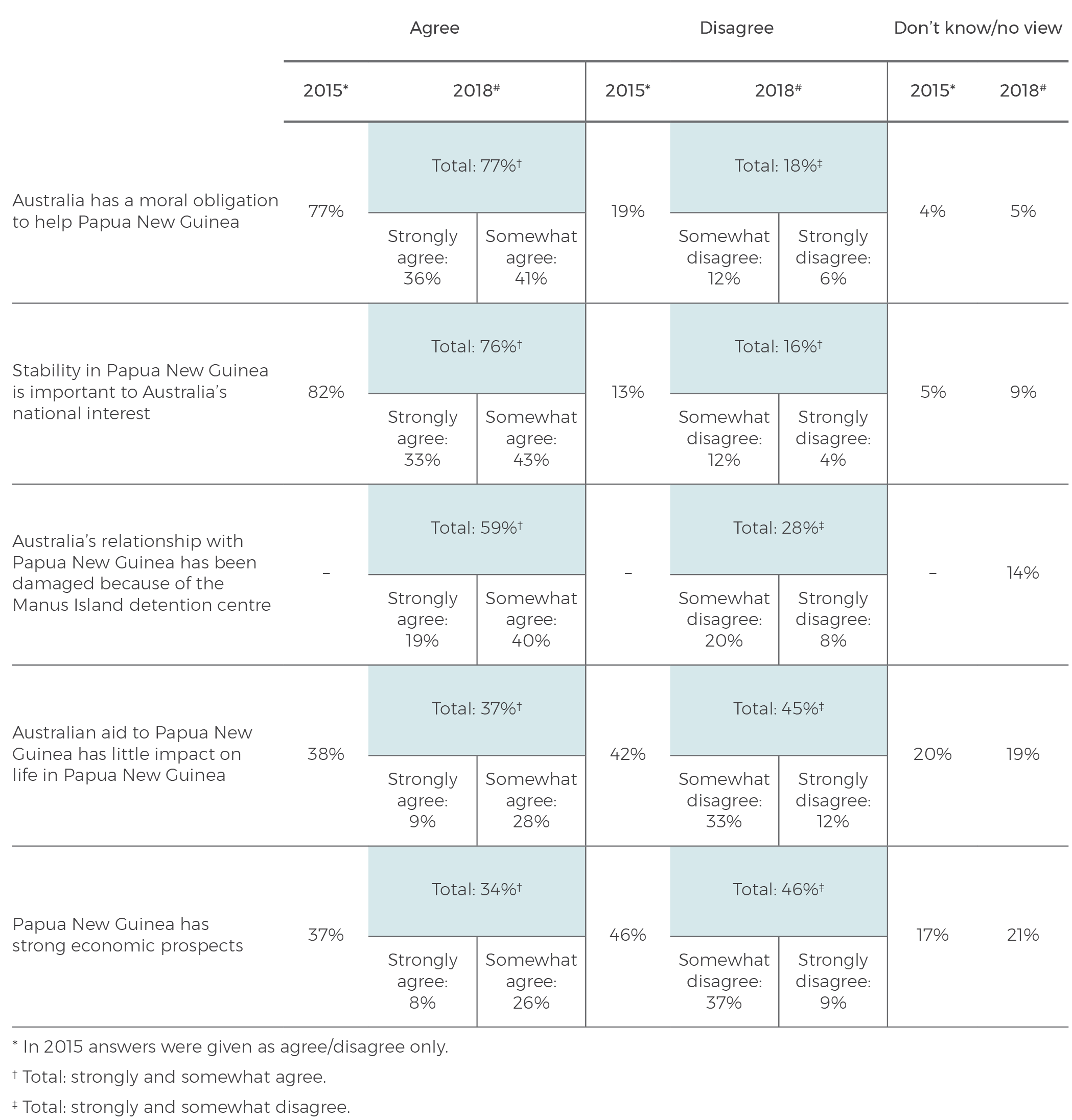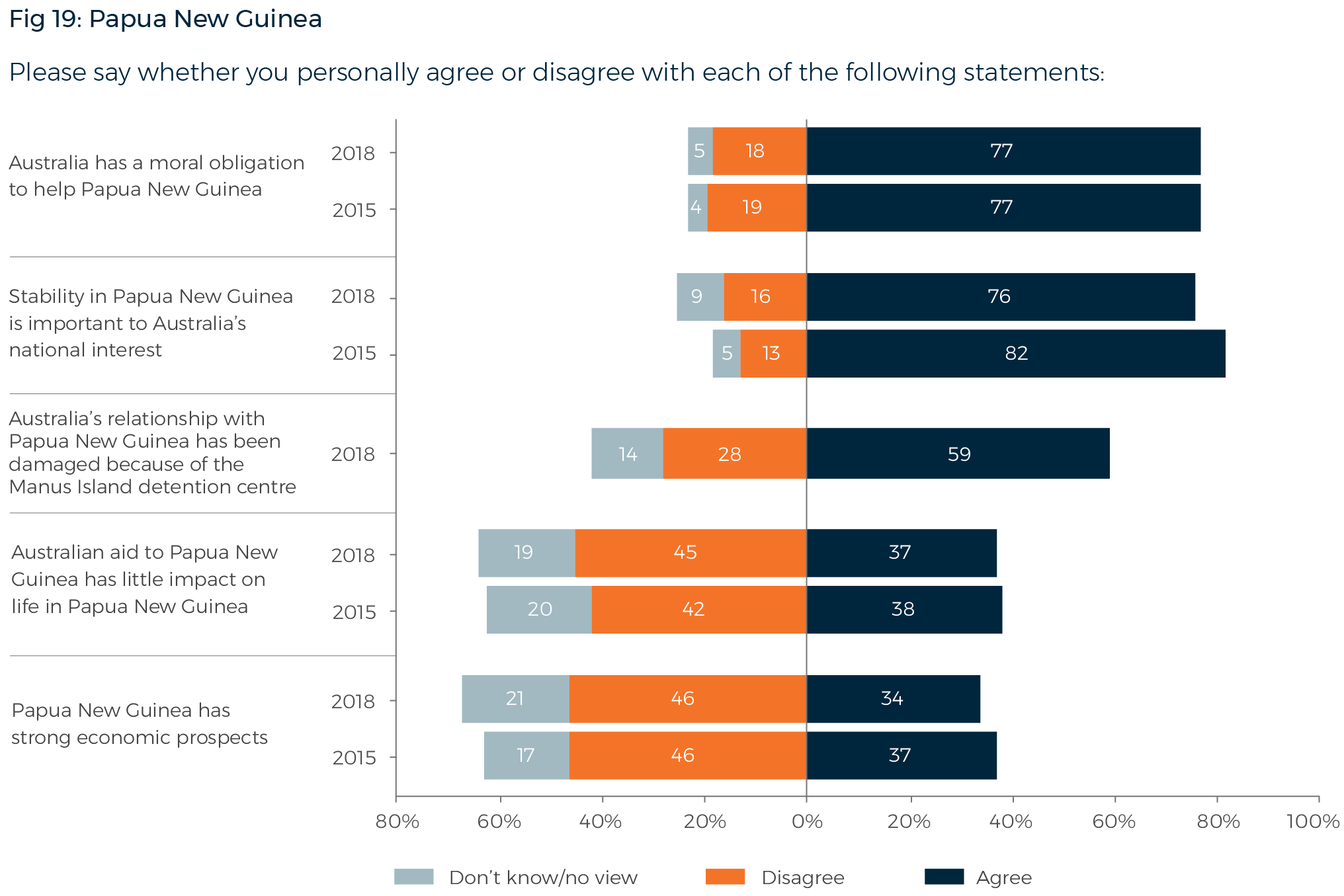 Most Australians say ‘stability in Papua New Guinea is important to Australia’s national interest’ (76%), and 77% say ‘Australia has a moral obligation to help Papua New Guinea’. They are divided, however, on the impact of aid: 37% agree and 45% disagree that ‘Australian aid … has little impact on life in Papua New Guinea’. A majority of Australians (59%) say ‘Australia’s relationship with Papua New Guinea has been damaged because of the Manus Island detention centre’.