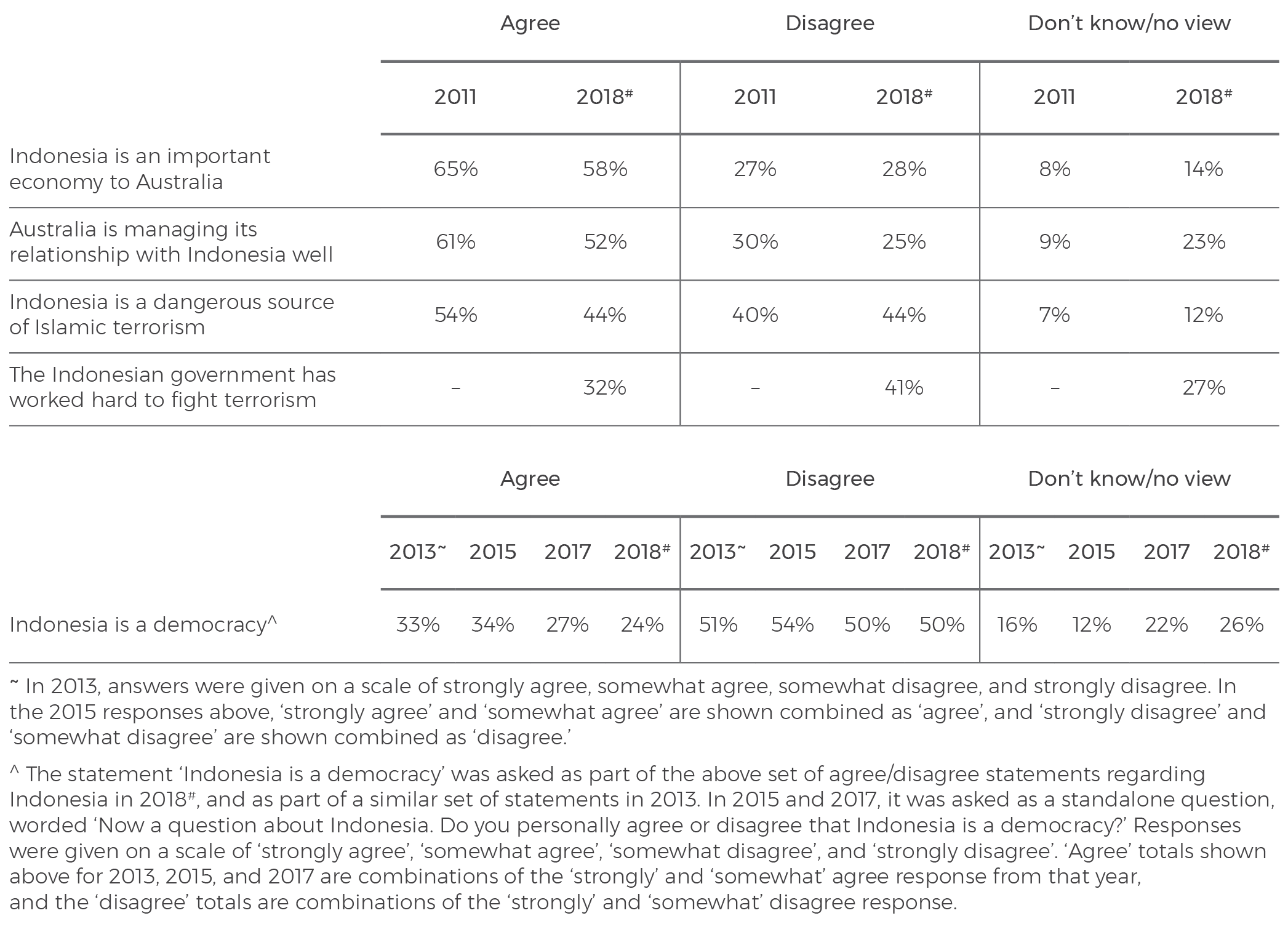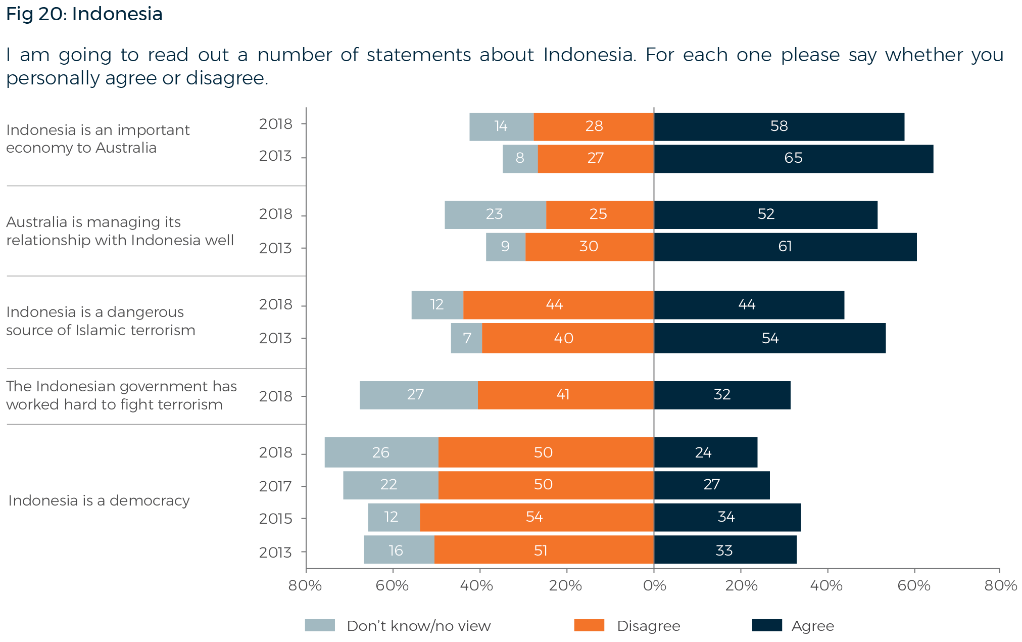 In 2018, only 24% of Australians agree that Indonesia is a democracy. They are divided (44% agreeing and 44% disagreeing) on whether ‘Indonesia is a dangerous source of terrorism’, and only 32% agree that ‘the Indonesian government has worked hard to fight terrorism’. A majority (58%) agree that ‘Indonesia is an important economy to Australia’, and 52% agree that ‘Australia is managing its relationship with Indonesia well’.