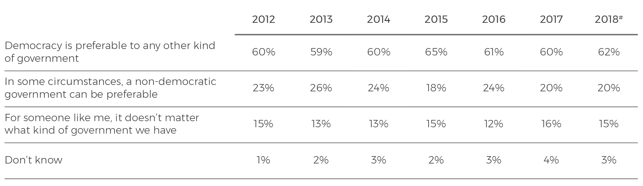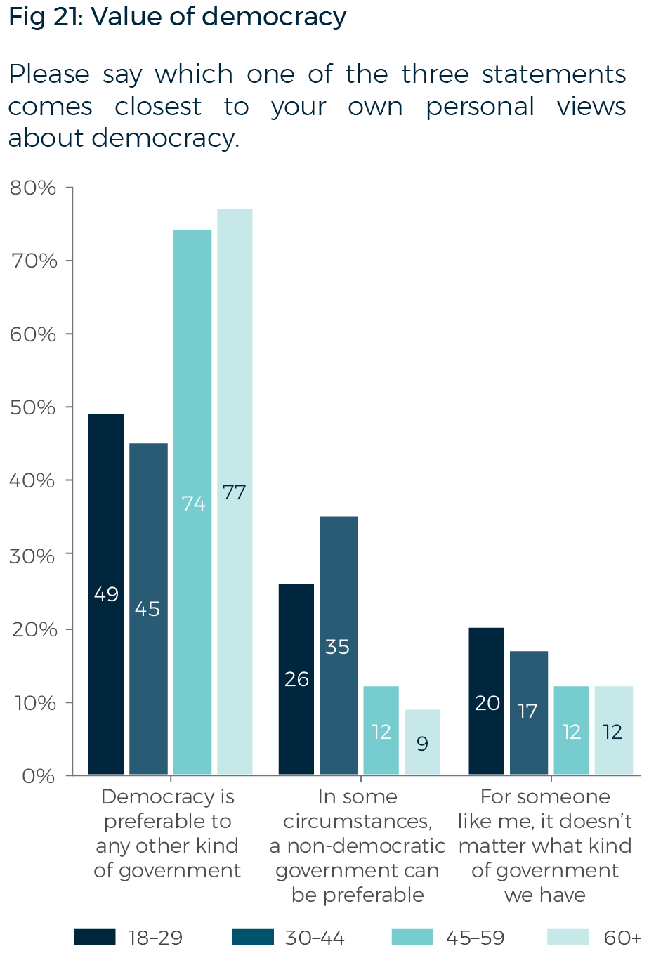 In similar results to previous years, 62% of Australians this year say ‘democracy is preferable to any other kind of government’; 20% say ‘in some circumstances, a non-democratic government can be preferable’; and 15% say ‘for someone like me, it doesn’t matter what kind of government we have’. Only 47% of Australians aged 18–44 years of age say ‘democracy is preferable to any other kind of government’.