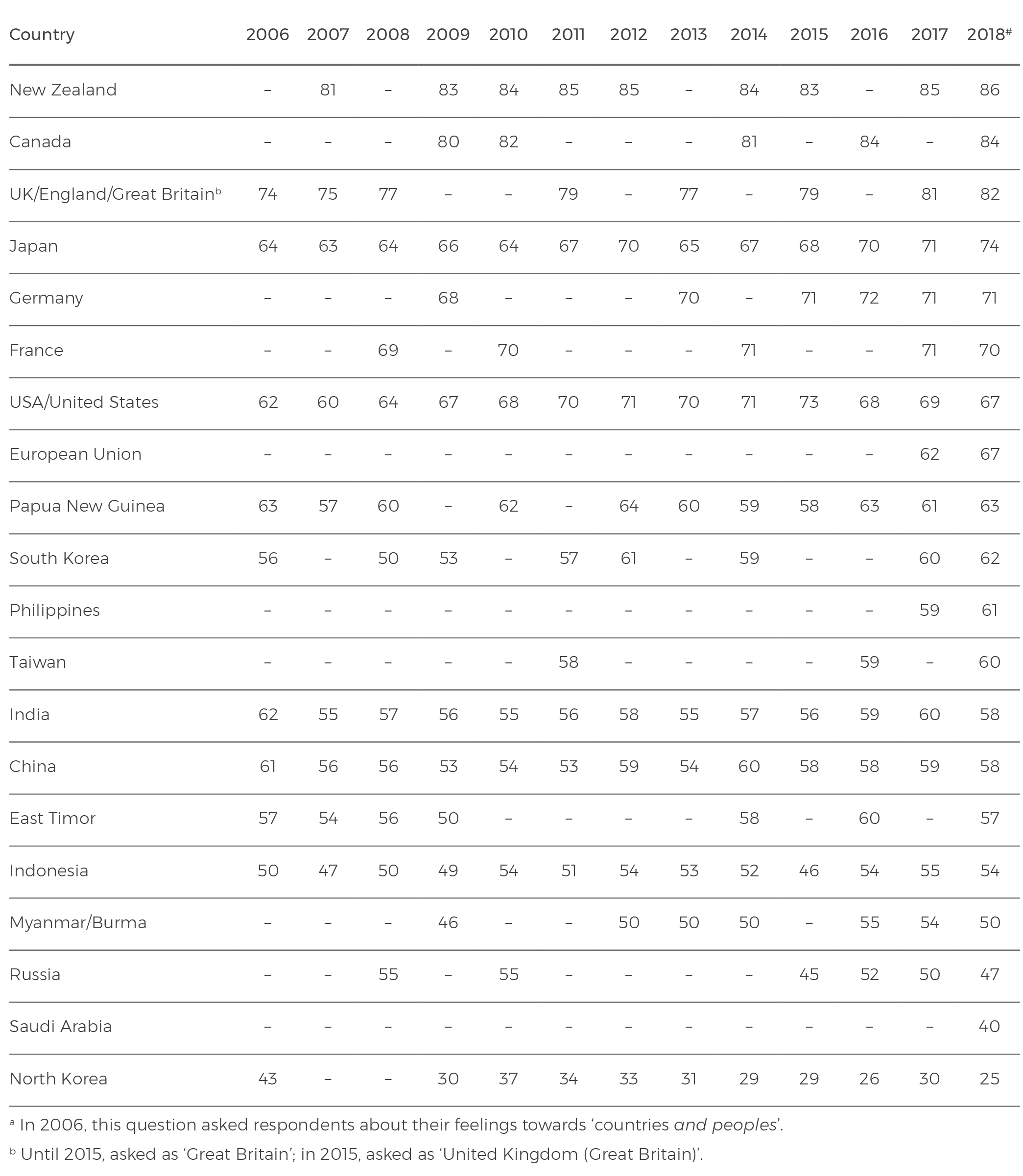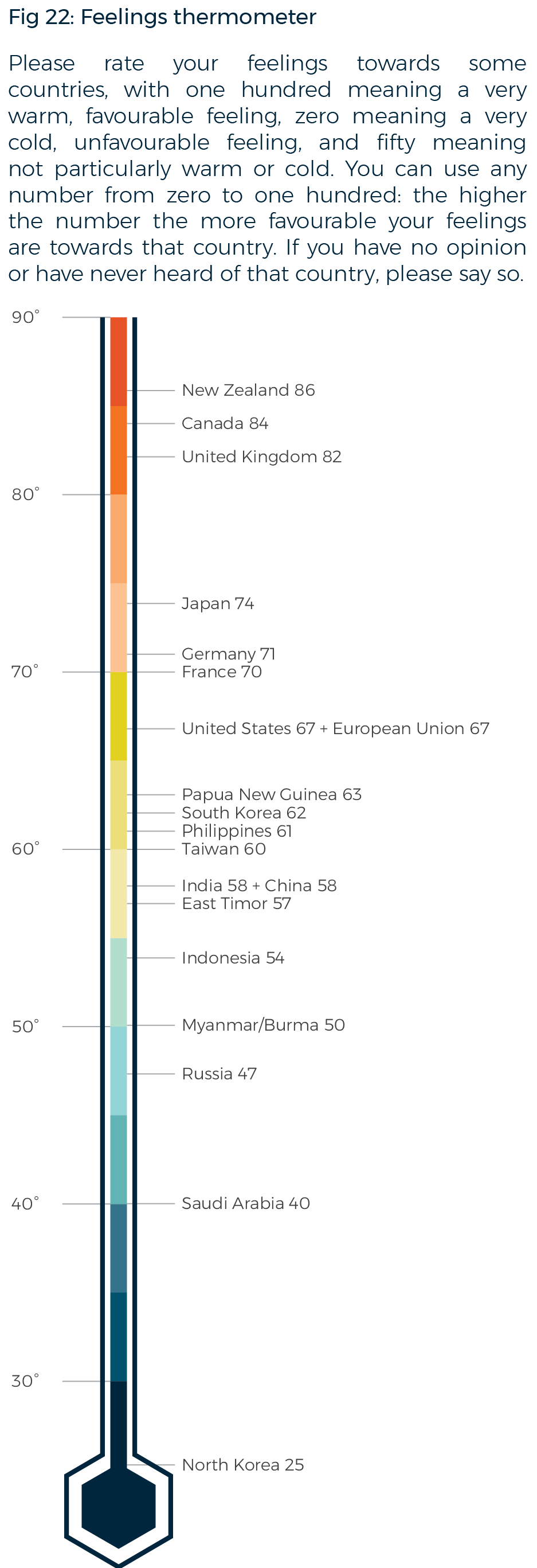 Every year, the Lowy Institute Poll includes a question about how Australians feel towards a range of countries across the world. The ‘feelings thermometer’ asks Australians to rate their feelings on a scale of 0–100°, where 0° is very cold and unfavourable, and 100° is very warm and favourable.
