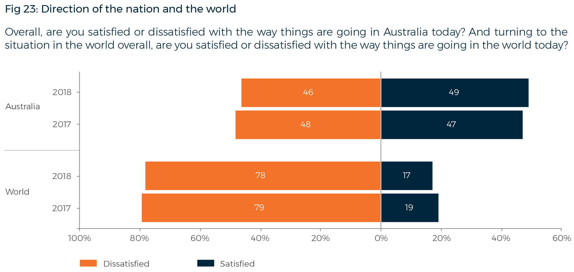 Only 17% of Australians are ‘satisfied with the way things are going in the world today’, while 78% are dissatisfied – a result almost unchanged since last year. Around half (49%) are satisfied with the way things are going in Australia today, and 46% are dissatisfied.