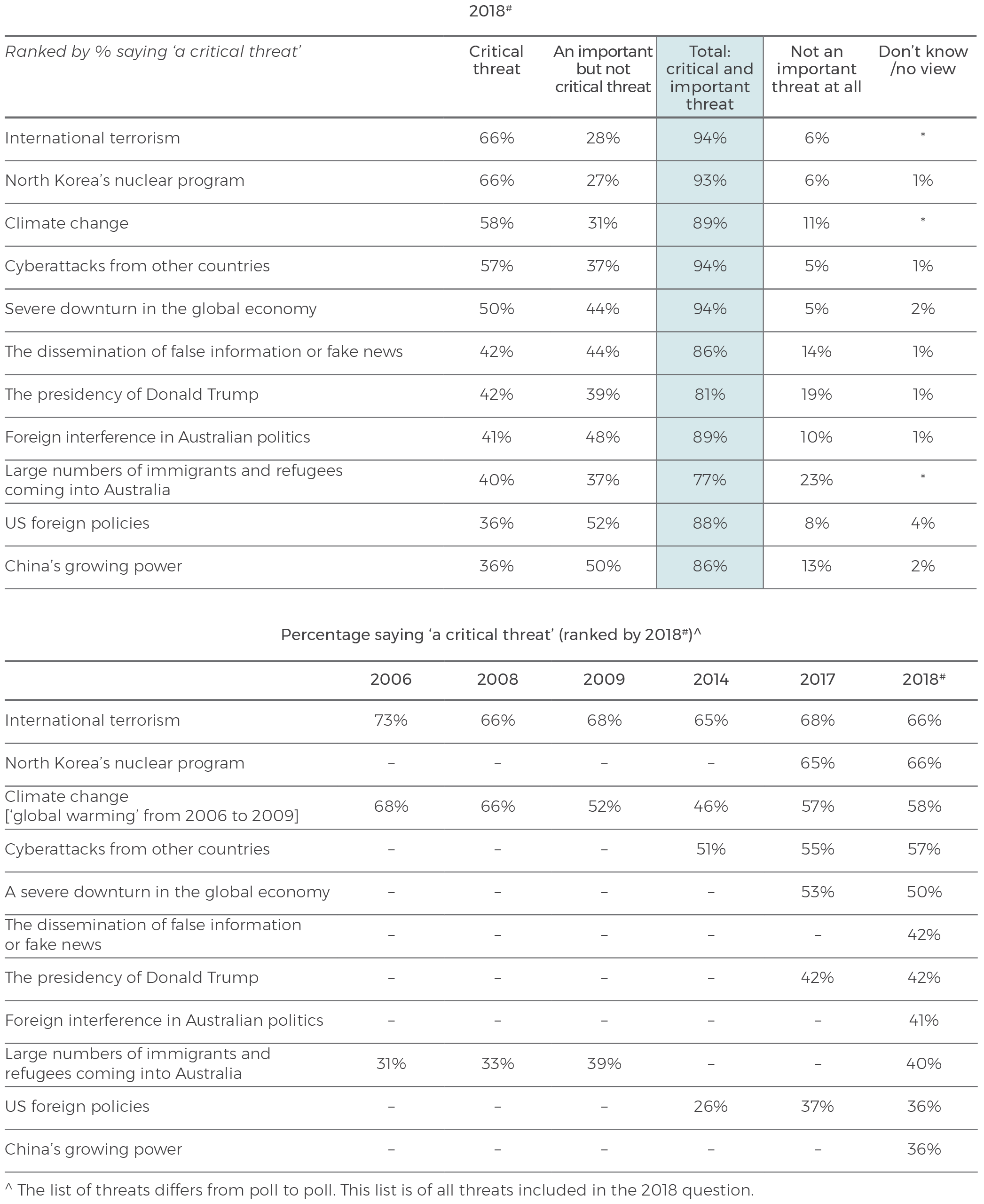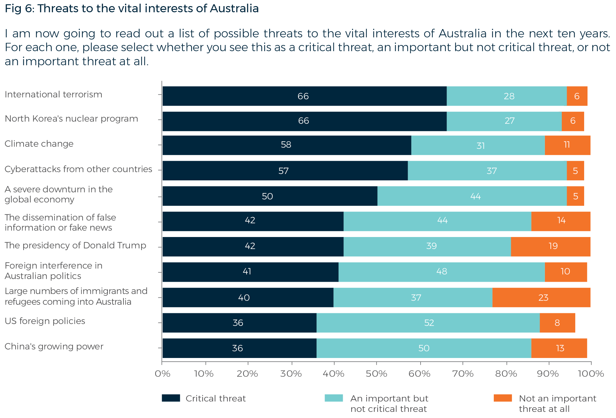 Terrorism and North Korea’s nuclear program are the highest ranked threats this year: 66% of Australians say ‘international terrorism’ and 66% say ‘North Korea’s nuclear program’ are critical threats to the vital interests of Australia in the next ten years. Climate change ranks third (58% saying critical threat). Cyberattacks from other countries are seen as a critical threat by 57%.