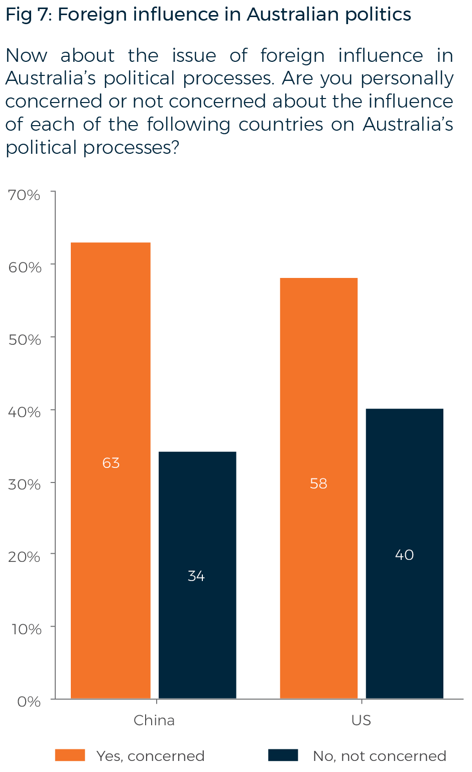 The public debate in 2017 revolved around the threat of Chinese influence. However, Australians’ concerns appear to be focused on foreign influence generally, rather than the threat posed by China specifically. When asked about influence from both China and the United States in Australia’s political processes, only marginally more Australians (63%) expressed concern about China than about the influence of the United States (58%).