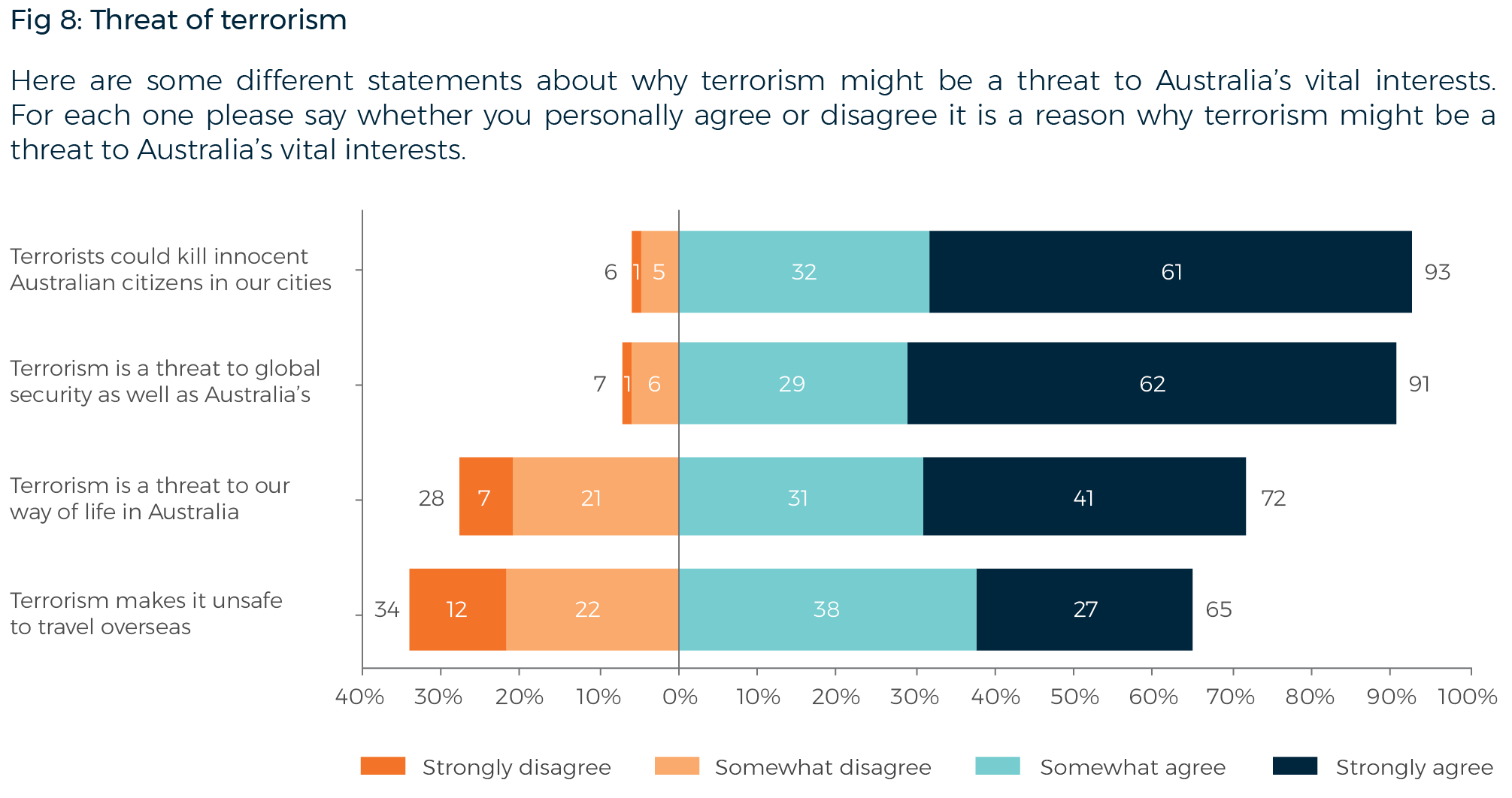 Table 8: Here are some different statements about why terrorism might be a threat to Australia’s vital interests. For each one, please say whether you personally agree or disagree it is a reason why terrorism might be a threat to Australia’s vital interests.