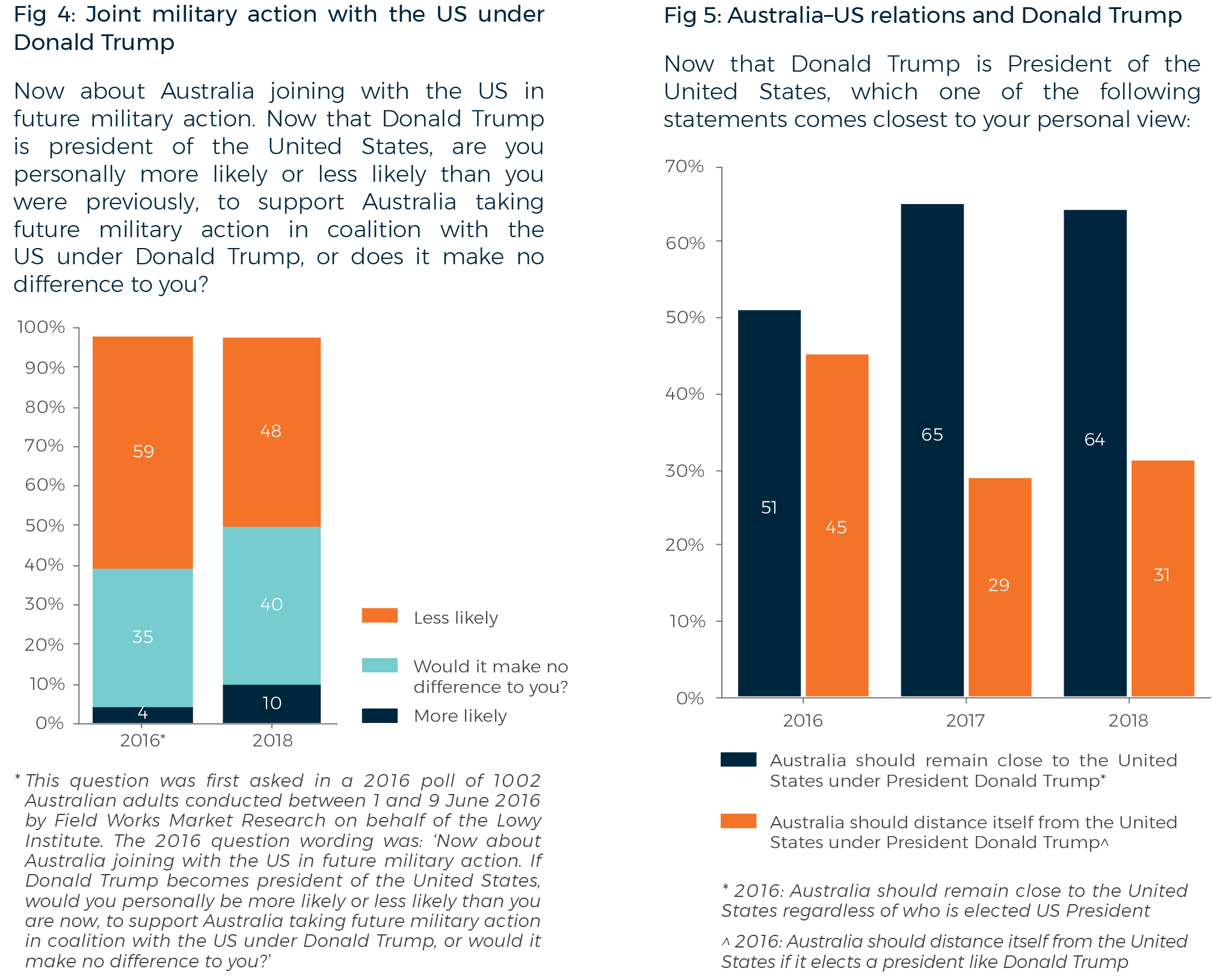 A number of questions in the 2018 Poll were first asked in previous Lowy Institute Polls, or have been adapted from questions asked in those years. Repeating questions in successive years allows us to compare public opinion on a single issue over time, building trend data on important international policy issues.