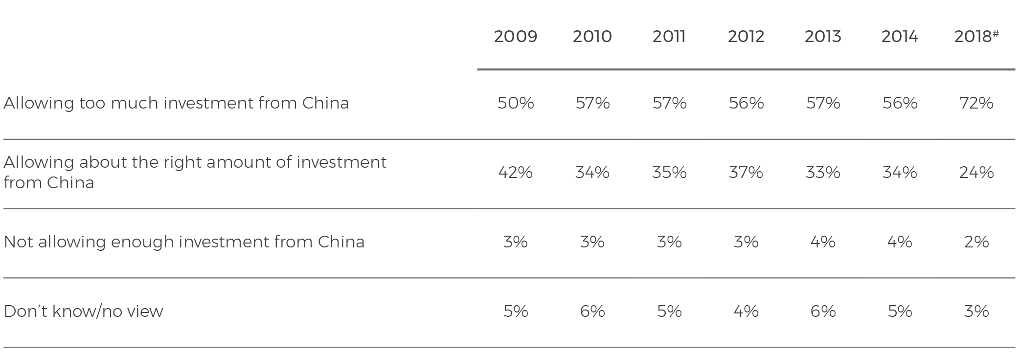 This year, there has been a sharp rise in the proportion of the Australian population who say the Australian government is ‘allowing too much investment from China’. Almost three-quarters (72%, up from 56% in 2014) now take this view.