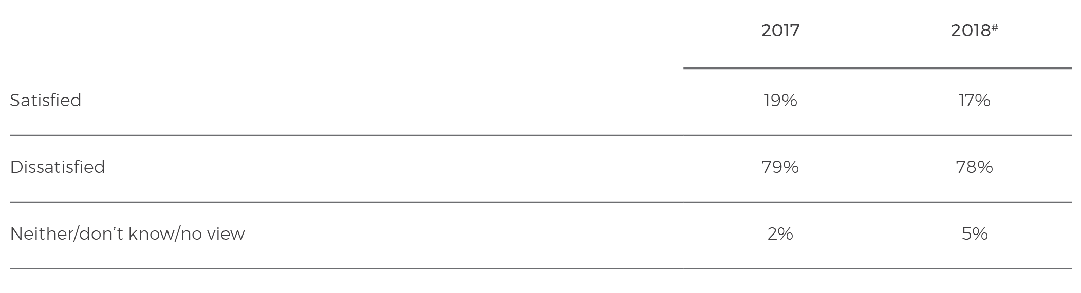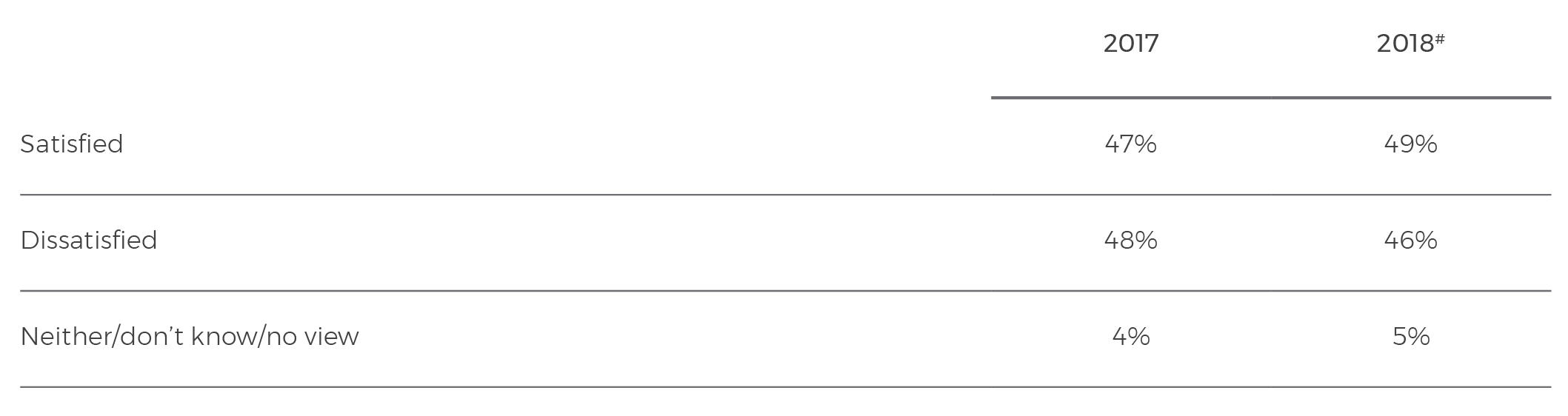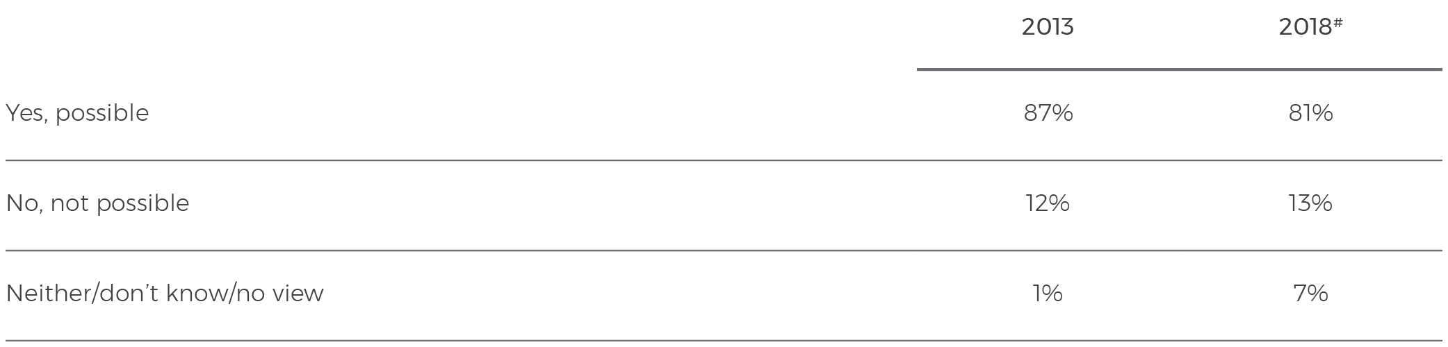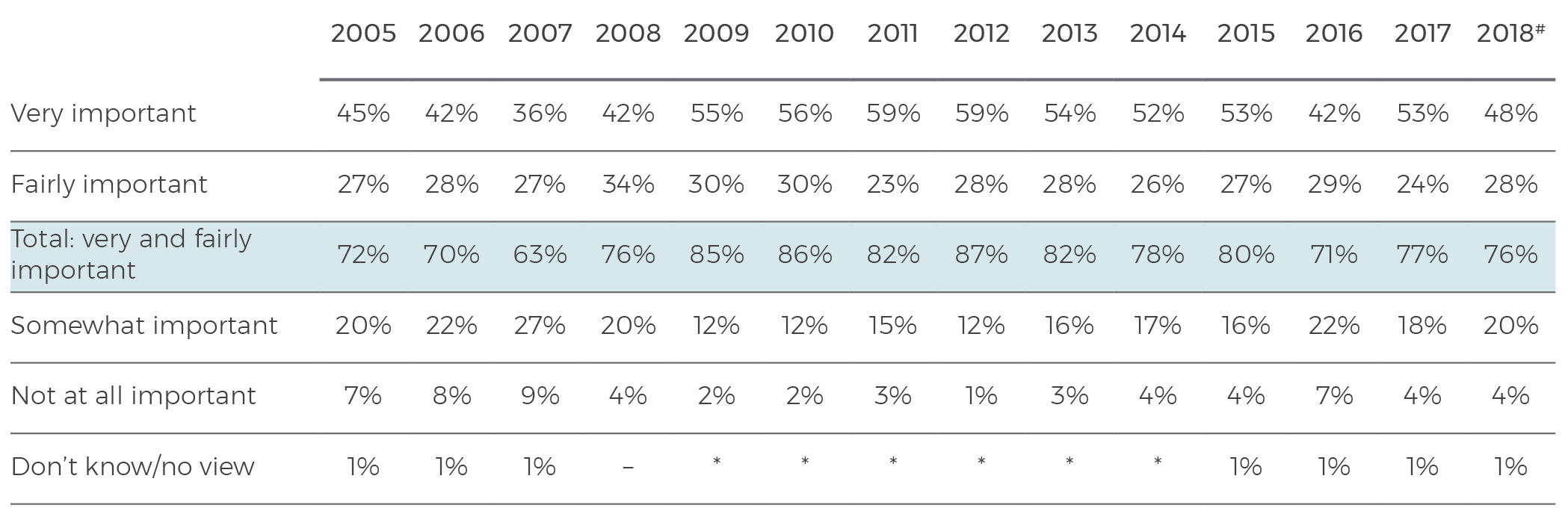 # In 2018 the poll fieldwork methodology differed from previous years, using a combined sample of 600 telephone responses and 600 online responses. See page 36 for further details.