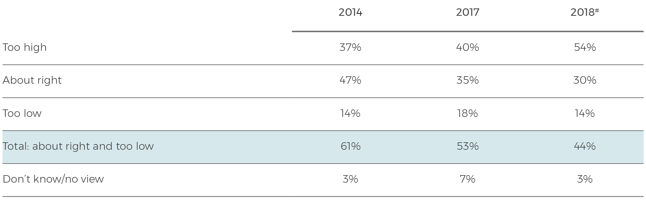 Table 18: Thinking now about Australia’s immigration program. Do you personally think that the total number of migrants coming to Australia each year is too high, too low, or about right?