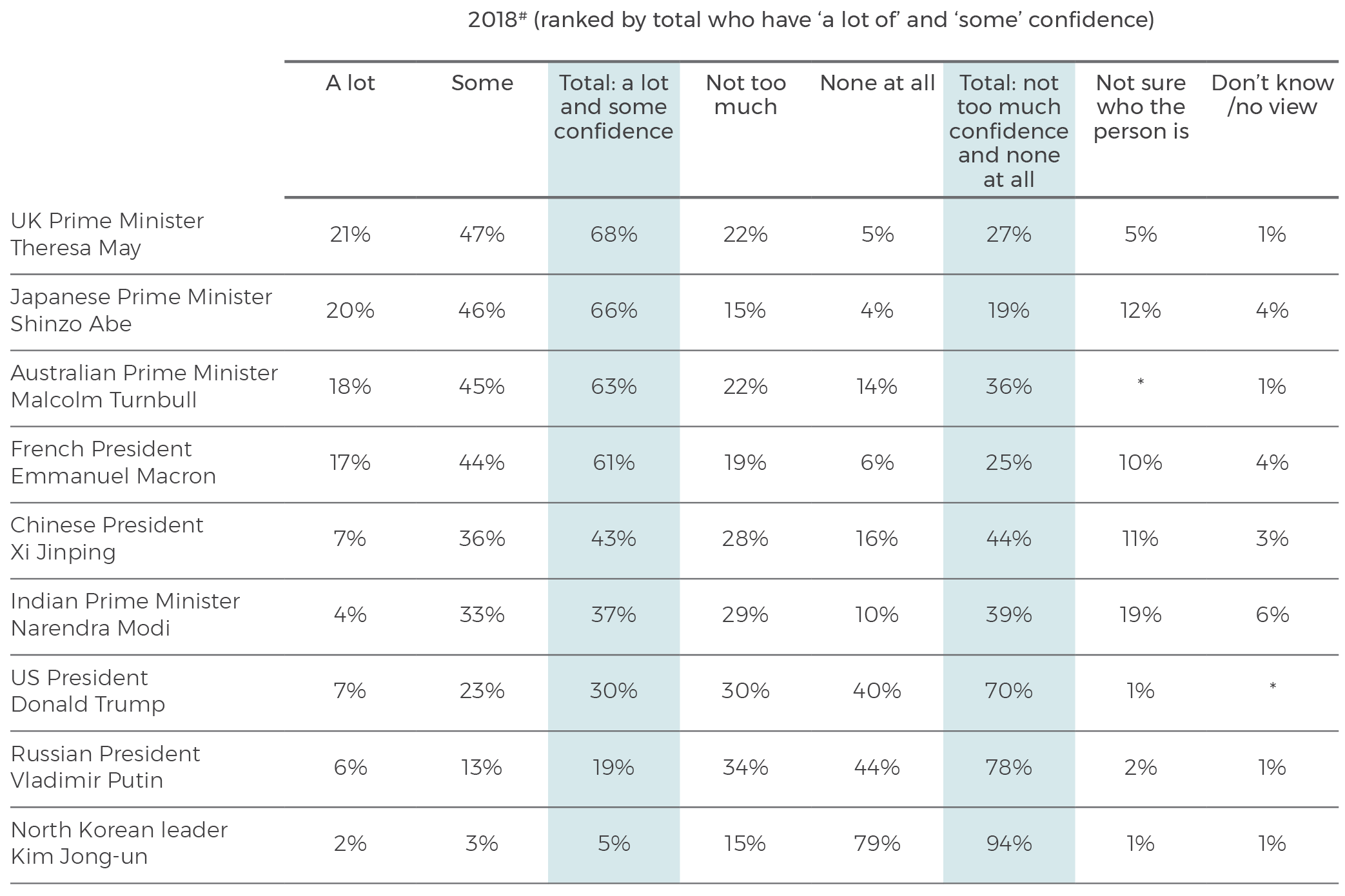 Only 30% of Australians have either ‘a lot’ or ‘some’ confidence in Donald Trump ‘to do the right thing regarding world affairs’. This places Trump ahead of only Russia’s Vladimir Putin (19%) and North Korean leader Kim Jong-un (5%) among the nine leaders ranked.The leaders Australians regard with the most confidence are the UK’s Theresa May (68%) and Japan’s Shinzo Abe (66%). Next is Malcolm Turnbull (63%), and France’s Emmanuel Macron has the confidence of 61%. Eighteen points behind is China’s Xi Jinping (43%), followed by India’s Narendra Modi (37%).