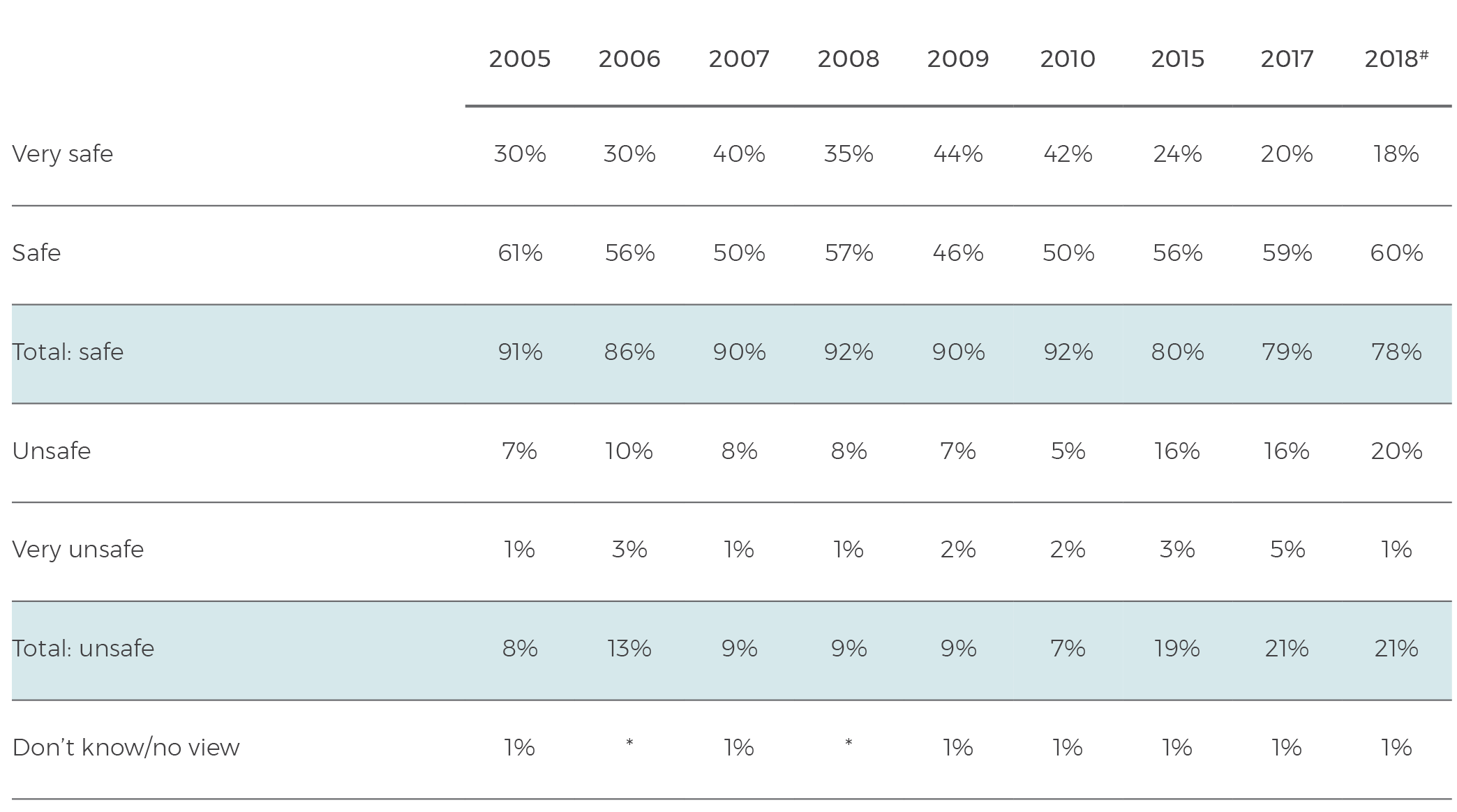 Australians’ feeling of safety is at its lowest level in our 14-year polling history. In 2018, 78% say they feel either ‘very safe’ or ‘safe’, a result 13 points lower than in 2005 when 91% felt safe.