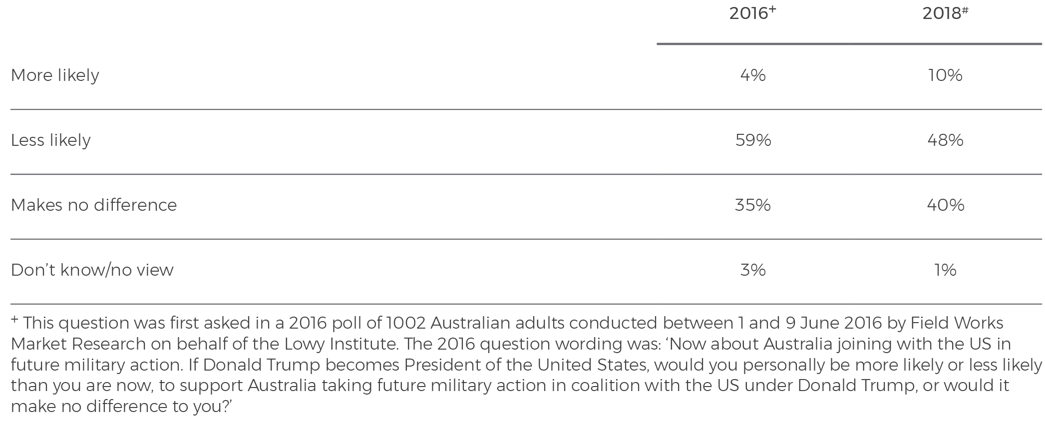 It appears this broad support for the US alliance is practical in nature, not merely symbolic. Despite Australians’ falling level of trust in the United States to act responsibly in the world, only 48% say they would be ‘less likely … to support Australia taking future military action in coalition with the United States under Donald Trump’ now that he is President. This is 11 points lower than the 59% of Australians in 2016 who said they would be less likely to support Australia taking military action with the United States under Donald Trump. In other words, reluctance about Australia joining the United States in military action under the Trump administration has eased since the new President took office.