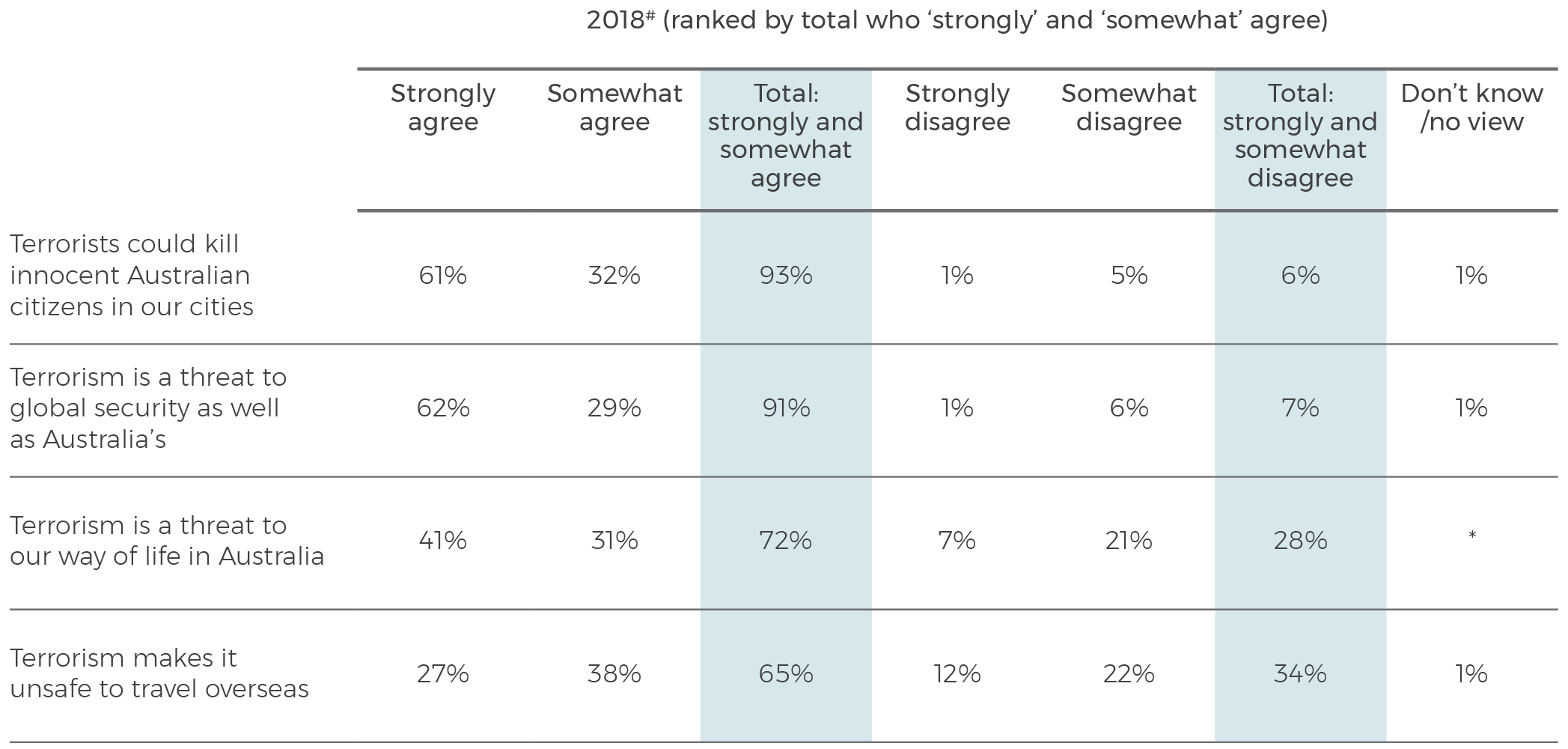 Overall, 94% of Australians see international terrorism as either a critical or important threat. Of those, 93% say it is a threat because ‘terrorists could kill innocent Australian citizens in our cities’. Fewer (72%) say it is a ‘threat to our way of life in Australia’, and two-thirds (65%) say ‘terrorism makes it unsafe to travel overseas’.