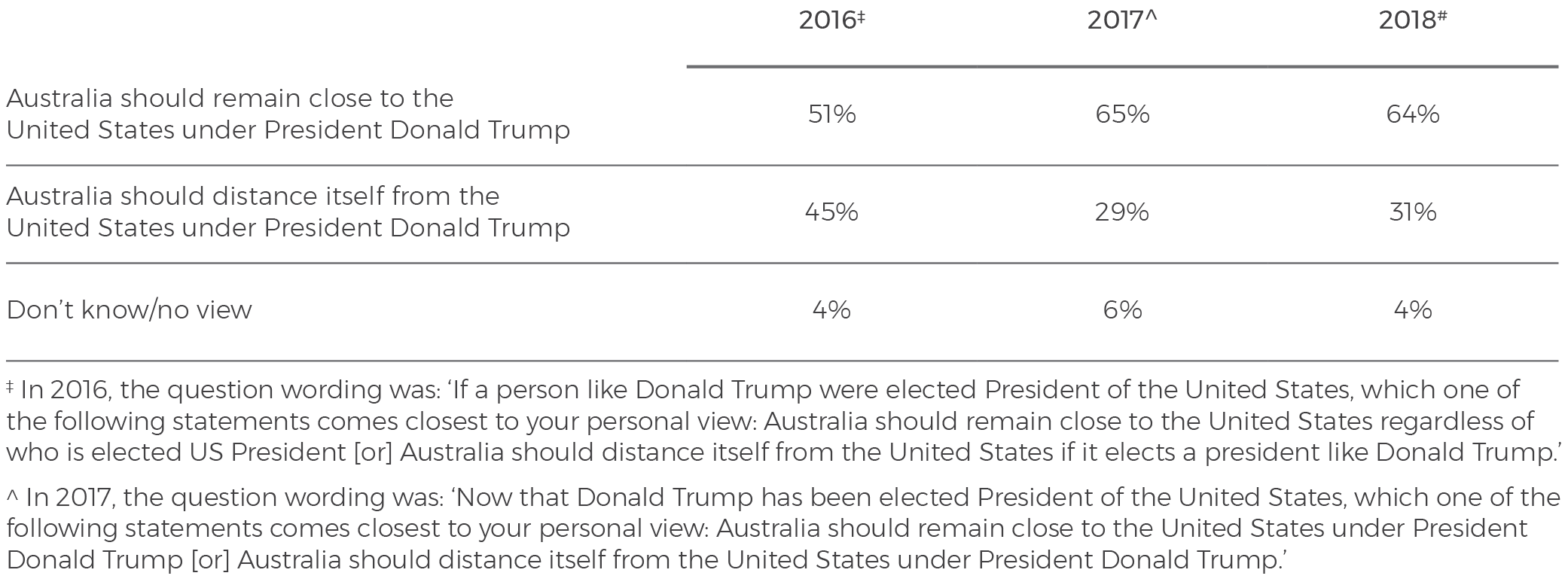 - Support for the US alliance remains firm, although trust in the US has fallen to its lowest level in our polling history, and most Australians have little confidence in President Donald Trump.
