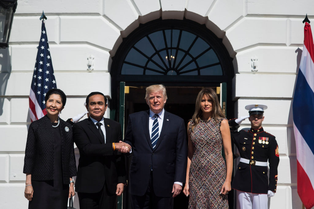 President Donald Trump and first lady Melania Trump greet Thailand's Prime Minister Prayuth Chan-ocha and his wife Naraporn Chan-ocha at the White House, October 2017 (Photo: Washington Post/Getty Images)
