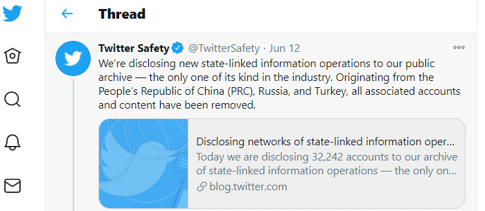 [103] Kate Conger, “Twitter Removes Chinese Disinformation Campaign”, The New York Times, 11 June 2020, https://www.nytimes.com/2020/06/11/technology/twitter-chinese-misinformation.html.