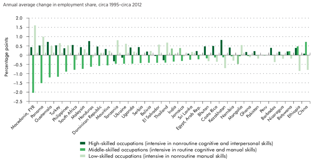 It shows that, during the period, workers in developing countries left middle-skilled occupations (negative variation, in dark green), while the number of workers in low- and high-skilled jobs increased (positive variation, in light green).