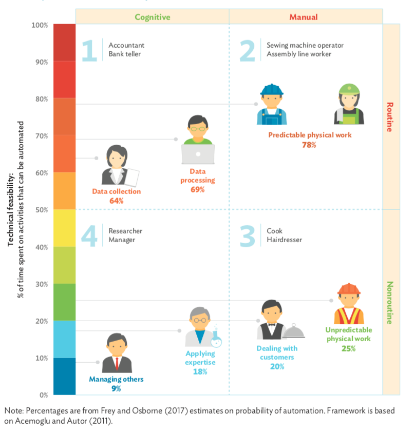 According to Autor, the technical feasibility of automating tasks using machines and computers is higher for cognitive and manual tasks that are routine (see quadrants 1 and 2 in the illustration above). These are the kinds of jobs at risk of displacement by labour-saving technology.