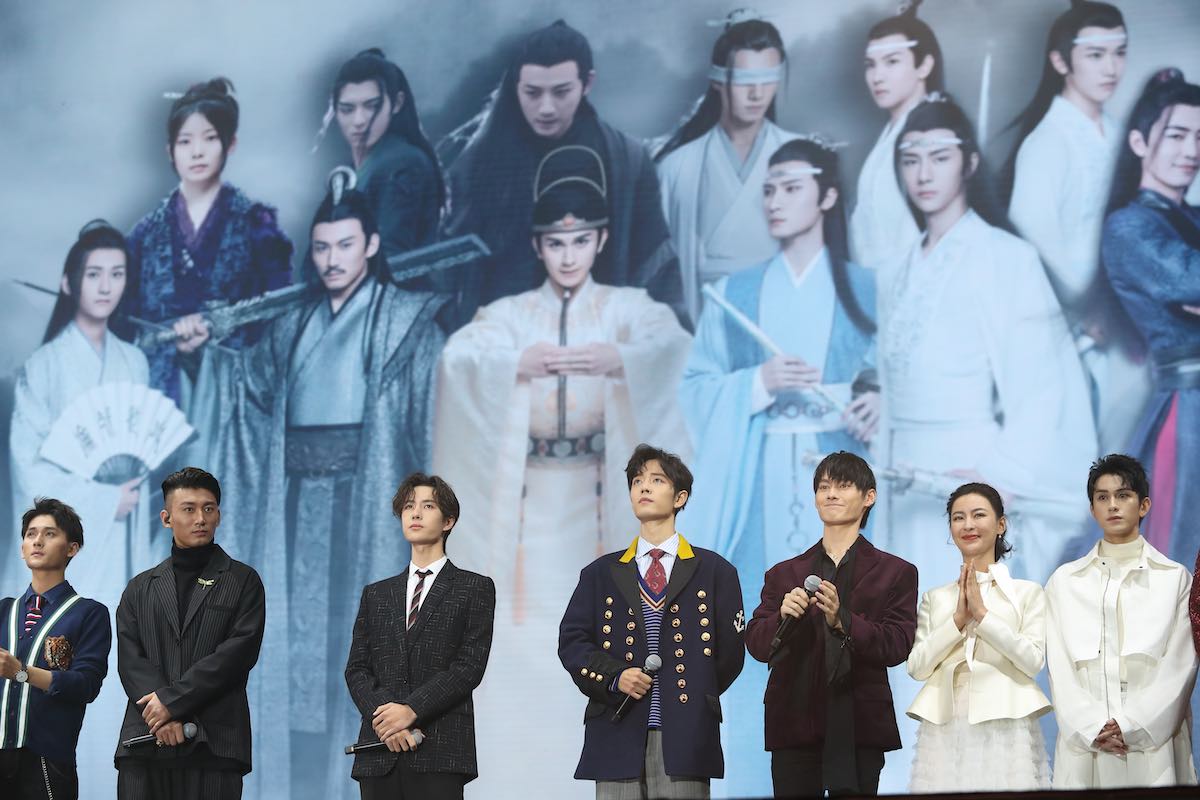 Actors from The Untamed including Xiao Zhan (third from right) and Wang Yibo (fourth from right) perform onstage during The Untamed National Style Concert in November 2019 in Nanjing, China (VCG via Getty Images)