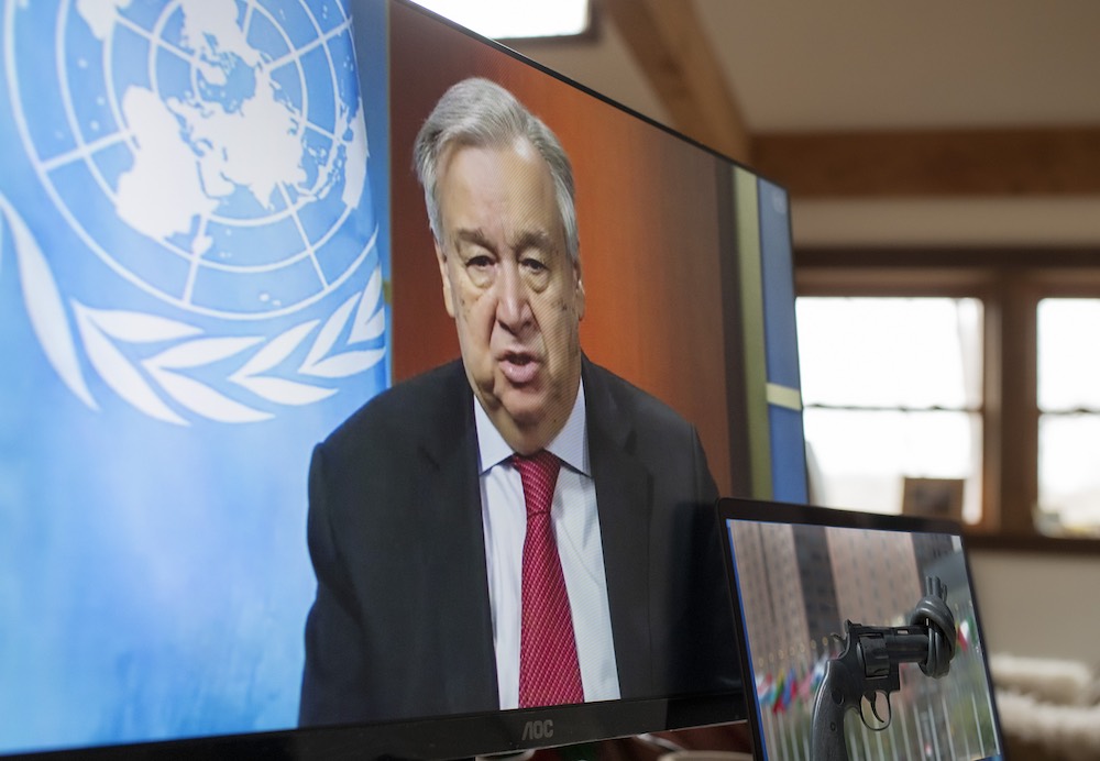 UN Secretary-General António Guterres holds a virtual press conference on the call for a global ceasefire during the Covid-19 pandemic, 3 April (Mark Garten/UN Photo)