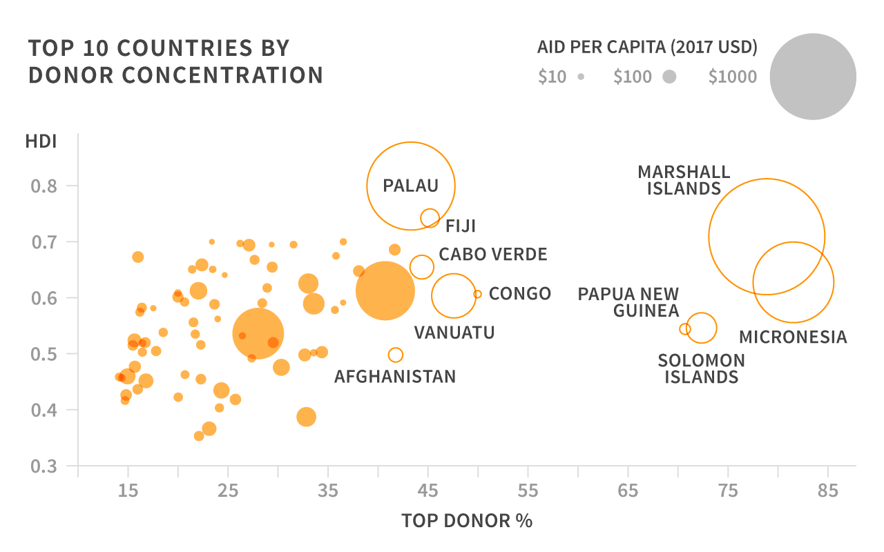 Another striking point is that 6 of the top 10 countries with the highest donor concentrations are located in the Pacific. For many smaller countries, particularly those with Compact of Free Association relationships with the United States, this makes sense. Solomon Islands also seems reasonable considering Australia’s lead role in the Regional Assistance Mission to Solomon Islands initiative to restore law and order.