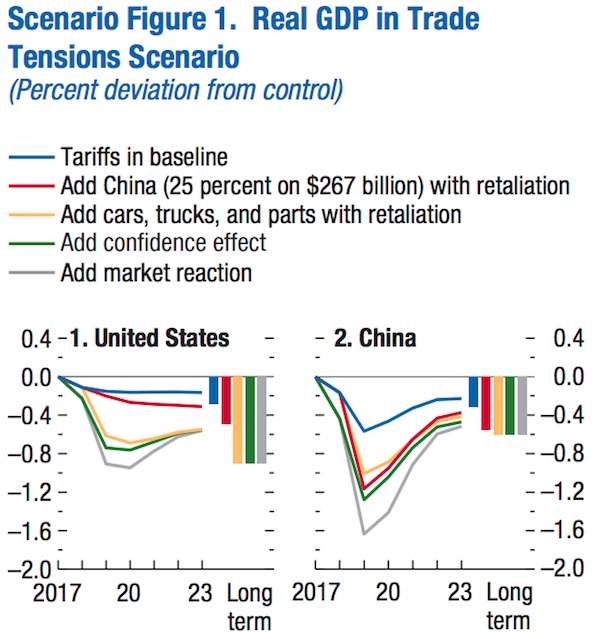 Indeed, these worst-case outcomes are not trivial and a full-scale global-wide trade war – as occurred in the 1930s – would matter. But these scenarios assume that NAFTA collapses (which now seems unlikely, renamed as USMCA), with most of the predicted disruption coming from new restrictions on automobile trade. The scenarios also assume a quite limited capacity on the part of countries to undertake policies to offset the shocks.