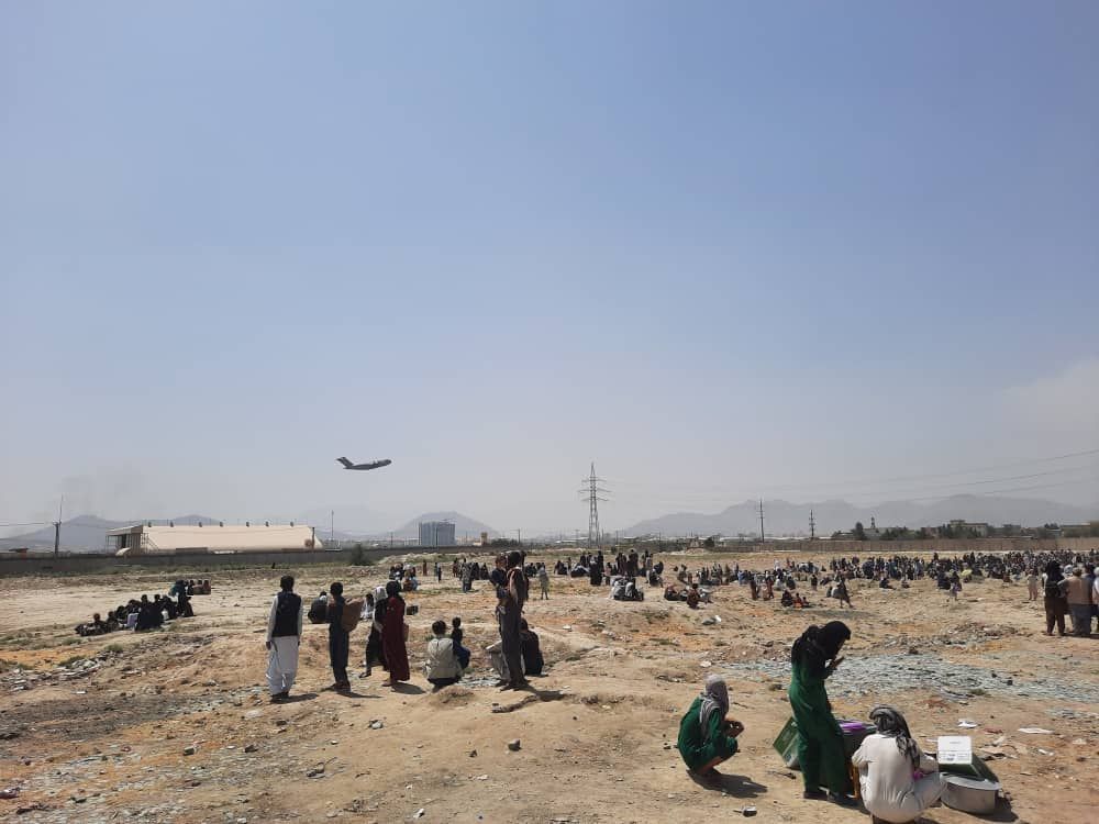 Crowds wait at the outskirts of Hamid Karzai International Airport, Kabul (Sayed Khodaiberdi Sadat/Anadolu Agency via Getty Images)