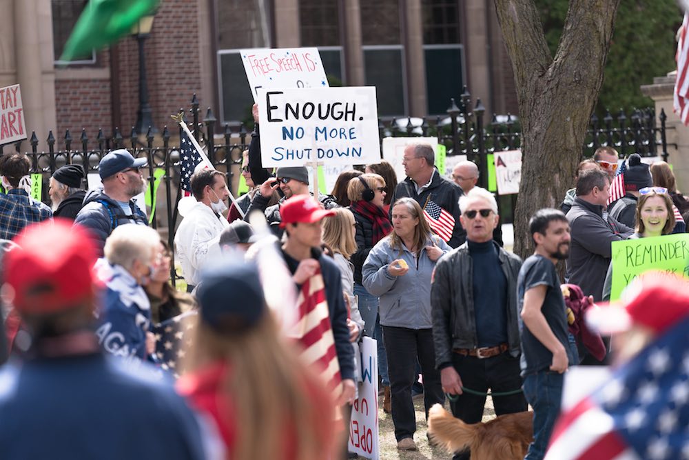 A protest at the governor’s residence in St Paul, Minnesota, in the US, calling for an end to lockdown restrictions to prevent the spread of Covid-19, 17 April (Lorie Shaull/Flickr)
