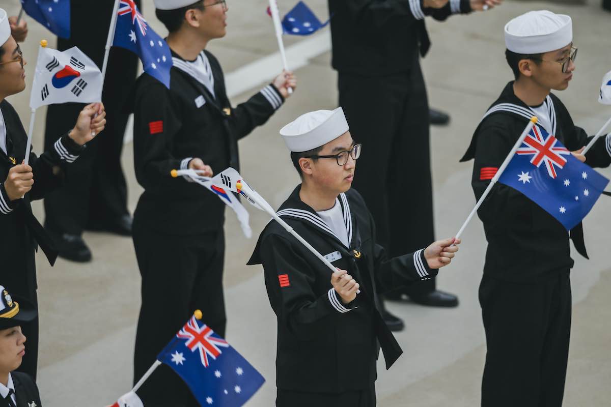 Republic of Korea Navy sailors welcome Royal Australian Navy frigate HMAS Melbourne at Jeju, South Korea, in 2018 (Department of Defence)
