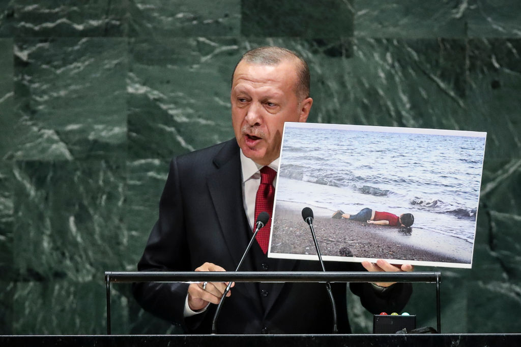 Turkish President Recep Tayyip Erdoğan displays the 2015 photo of drowned Syrian Kurdish toddler Alan Kurdi at the UN General Assembly in September 2019 (Drew Angerer/Getty Images)