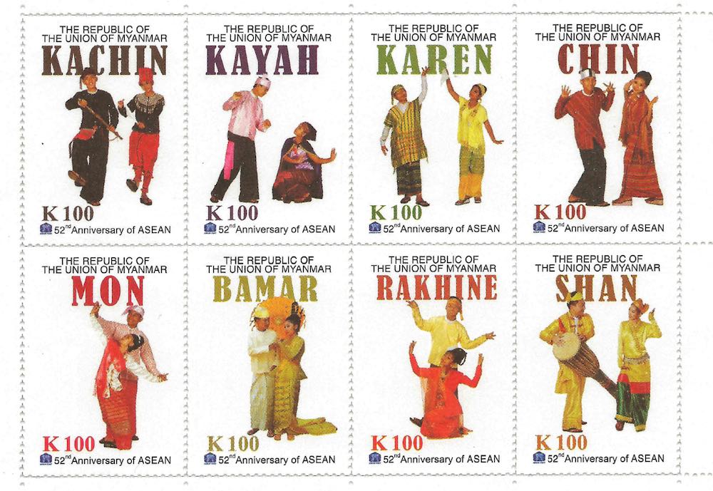 This was suggested recently by the issue of a new set of stamps by Myanmar Post, an agency of the reorganised Ministry of Transport and Communications. In two mini-sheets of eight stamps each, and on the associated first day covers, there are depictions of the country’s eight recognised “national races”, namely the Bamar (Burman), Kachin, Kayah (Karenni), Karen (Kayin), Chin, Mon, Rakhine (Arakanese), and Shan communities.