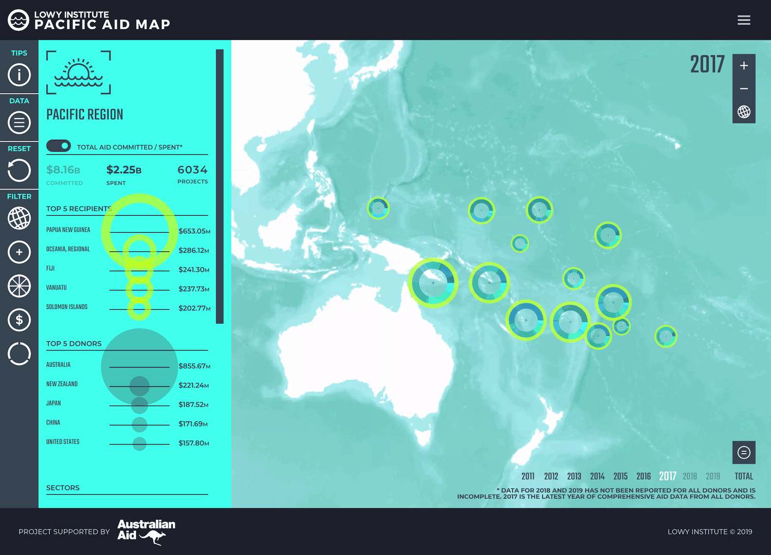 We are pleased to be able to commit to keeping the Aid Map updated for at least another three years. Over that time, we hope to diversify further the sources of financial flows that we can incorporate into the map. We want to take a closer look at the performance of aid, and we want to deepen our analysis of the underlying data (the first example of which will come in the form of soon-to-be-released Pacific debt analysis). And we are eager to keep promoting the map to ensure that it becomes the benchmark for aid information in the Pacific. The Pacific Aid Map is a tool that we are exceptionally proud of, and we look forward to making it better in the years to come.