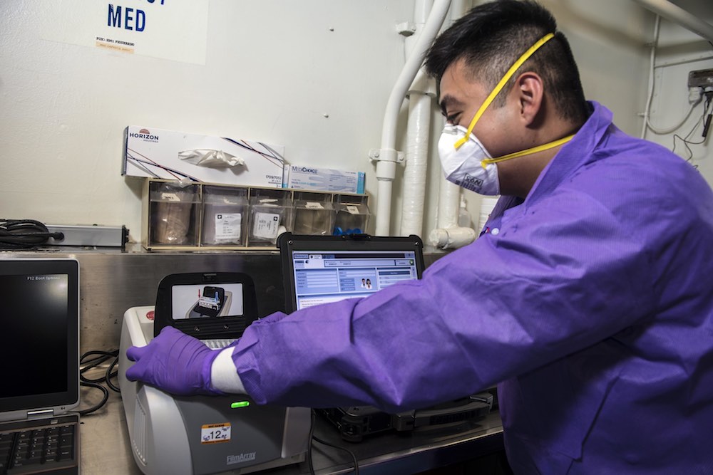 A technician tests swab samples of sailors aboard the USS Blue Ridge in the South China Sea, 14 March (Leonard Adams/US Pacific Fleet/Flickr)