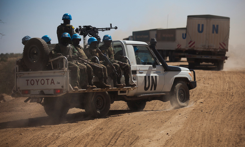 Rwandan peacekeepers from the UN-AU Mission in Darfur escort a WFP convoy bringing food aid to camps for displaced people in North Darfur, Sudan, 2014 (Albert González Farran/UN Photo/Flickr)