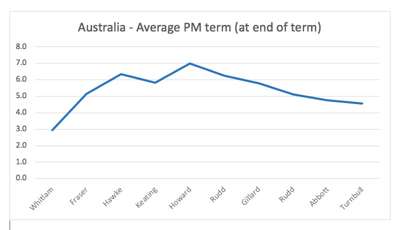 In Australia, when John Howard became prime minister in 1996, his predecessors from 1975 – including Gough Whitlam – had served an average of 5.8 years in office. Howard himself managed 11.7 years in the top job, but since then the revolving door in Canberra has reduced the average down to 4.6 years for each prime ministerial term since 1975.