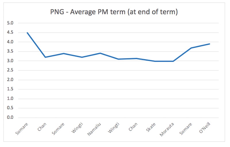 Peter O’Neill’s return to government after last year’s election means the average term for a PNG PM since independence is up to 3.9 years.