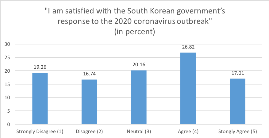 First, we asked on a five-point scale (strongly disagree to strongly agree) “Please evaluate the following statement: I am satisfied with the South Korean government’s response to the 2020 coronavirus outbreak”. Overall, we found that a plurality (43.83%) agreed, while over a third (36%) disagreed. This response cannot be considered a blanket condemnation of Moon’s response, despite what some analysts have suggested.