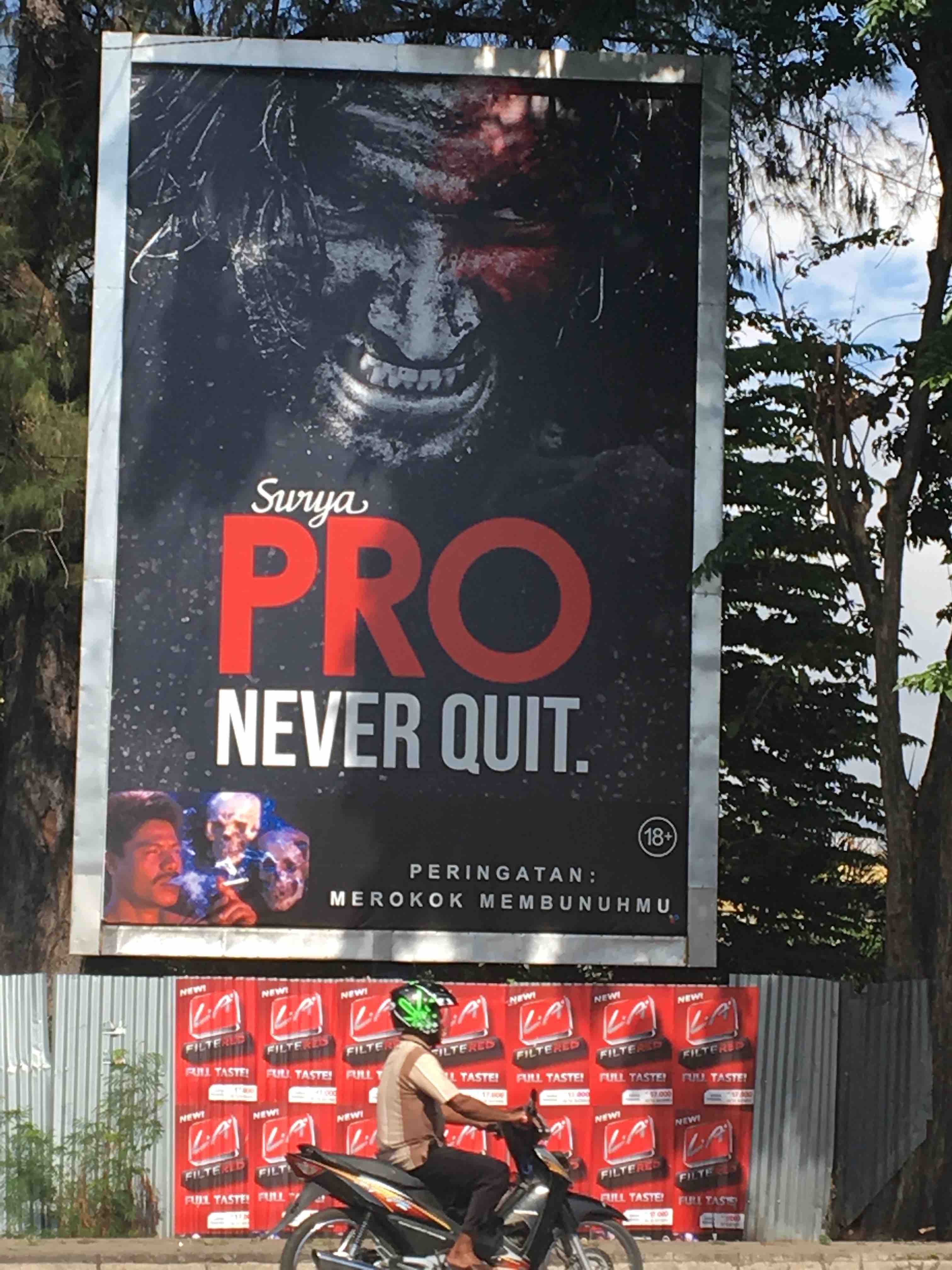 Observe the marketing brilliance embodied in these banners and hoardings found in Flores and Bali. The macho reality-TV adventurer is a picture of rugged determination: “Never quit!”