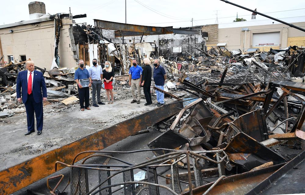 US President Donald Trump (L) views the aftermath of civil unrest in Kenosha, Wisconsin, 1 September 2020 (Mandel Ngan/AFP via Getty Images)