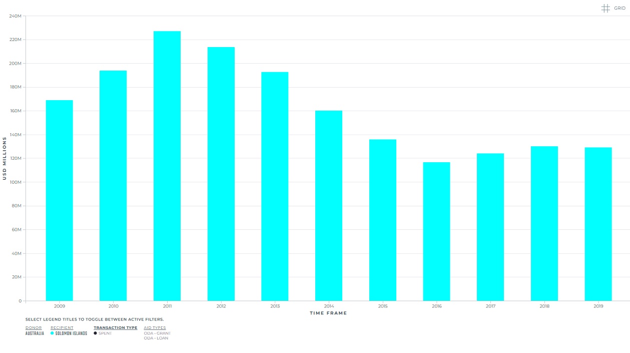 - In Solomon Islands, however, the story is different. After peaking in 2011, Australian aid to the archipelago decreased by 43 per cent to US$129 million in 2019. Between 2009 and 2019, Solomon Islands has suffered the largest cut from the Australian aid program in the Pacific. The end of RAMSI, the multiyear Australian intervention that served to restore law and order in Solomon Islands after ethnic tensions, partly explains this decrease.