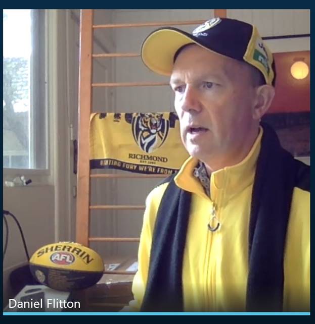 A colleague’s screenshot of our video conference call last September during the AFL finals. Go Tiges.