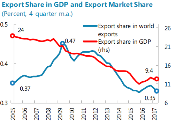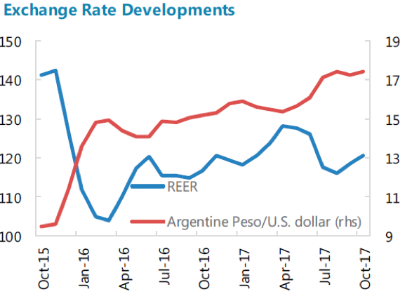 While the nominal exchange rate was depreciating steadily (and more quickly recently), inflation has outpaced this decline, eroding international competitiveness. The IMF estimates that the peso is overvalued by 10–25%. Exports have fallen from 24% of GDP in 2005 to 9% now, and the current account deficit is 5% of GDP.