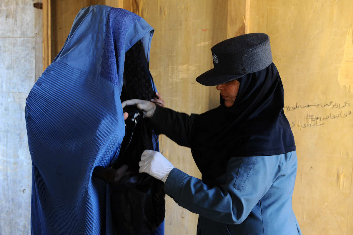 An Afghan policewoman conducts a search in Herat province during 2014 elections (Aref Karimi/AFP via Getty Images)